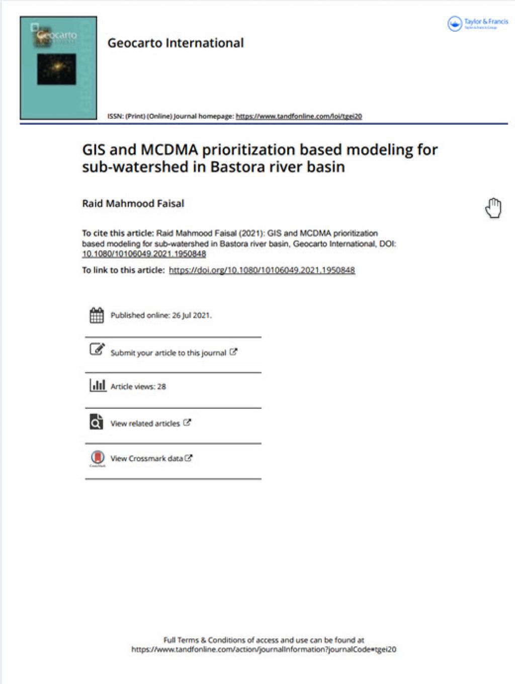 نشر المدرس رائد محمود فيصل التدريسي في قسم تقانات البيئة بحث علمي بعنوان”GIS and MCDMA prioritization based modeling for sub-watershed in Bastora river basin”في مجلة مصنفة ضمن الربع الاول من المستوعب سكوبس Geocarto International في دار النشرTaylor & Francis.. نبارك له هذا الانجاز متمنين له دوام الموفقية والتقدم.شعبة الاعلام والعلاقات العامة