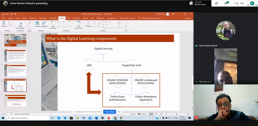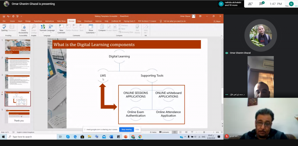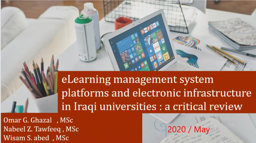 حرصاً على تنفيذ توجيهات السيد رئيس جامعة الموصل الاستاذ الدكتور قصي كمال الدين الاحمدي بضرورة ديمومة التواصل العلمي وباشراف مباشر من قبل السيدة عميد الكلية الاستاذ المساعد الدكتورة يسرى مجيد الشاكر القى المدرس المساعد عمر غانم غزال والمدرس المساعد نبيل زهير توفيق سمنر بعنوان “E learning management system platforms and electronic infrastructure in Iraq universities: a critical review” الذي يهدف الى انشاء استطلاع حول المنصات التعليمية المستخدمة في العراق والمعوقات والقيود التي يواجهها التدريسين والطلبة في استخدامها لغرض الخروج بمقترح علمي يمكن تطبيقه على ارض الواقع ضمن الماديات المتوفرة في الجامعات العراقية.