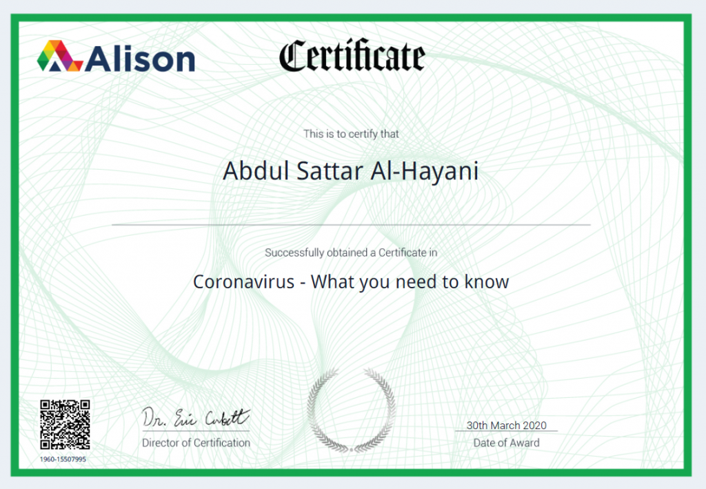 شهادة دولية يحصل عليها المدرس الدكتور عبد الستار جبيرالحياني التدريســي في كلية علوم البيئة وتقاناتها/ قسم تقانات البيئة بعد ان اجتاز كورسا علميـا تحت عنوان “Coronavirus – What you need to know” الذي يتمحور حول مايجب معرفته عن فايروس كورونا COVID-19 المستجد. متمنين له دوام الموفقيـــــة والنجاح.