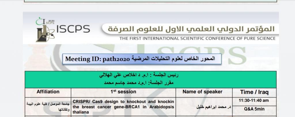 شارك الاستاذ المساعد الدكتور محمد ابراهيم خليل / رئيس قسم علوم البيئة في اعمال المؤتمر الدولي العلمي الأول للعلوم الصرفة المقام في جامعة الكوفة كلية العلوم بالبحث الموسوم ” CRISPR/Cas9 design to knockout and knockin the breast cancer gene-BRCA1 in Arabidopsis thaliana “متمنين له دوام الموفقية والنجاح