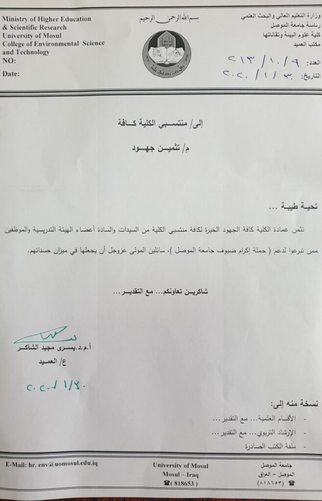 شكر وتقدير من السيدة عميد الكلية إلى منتسبي الكلية
