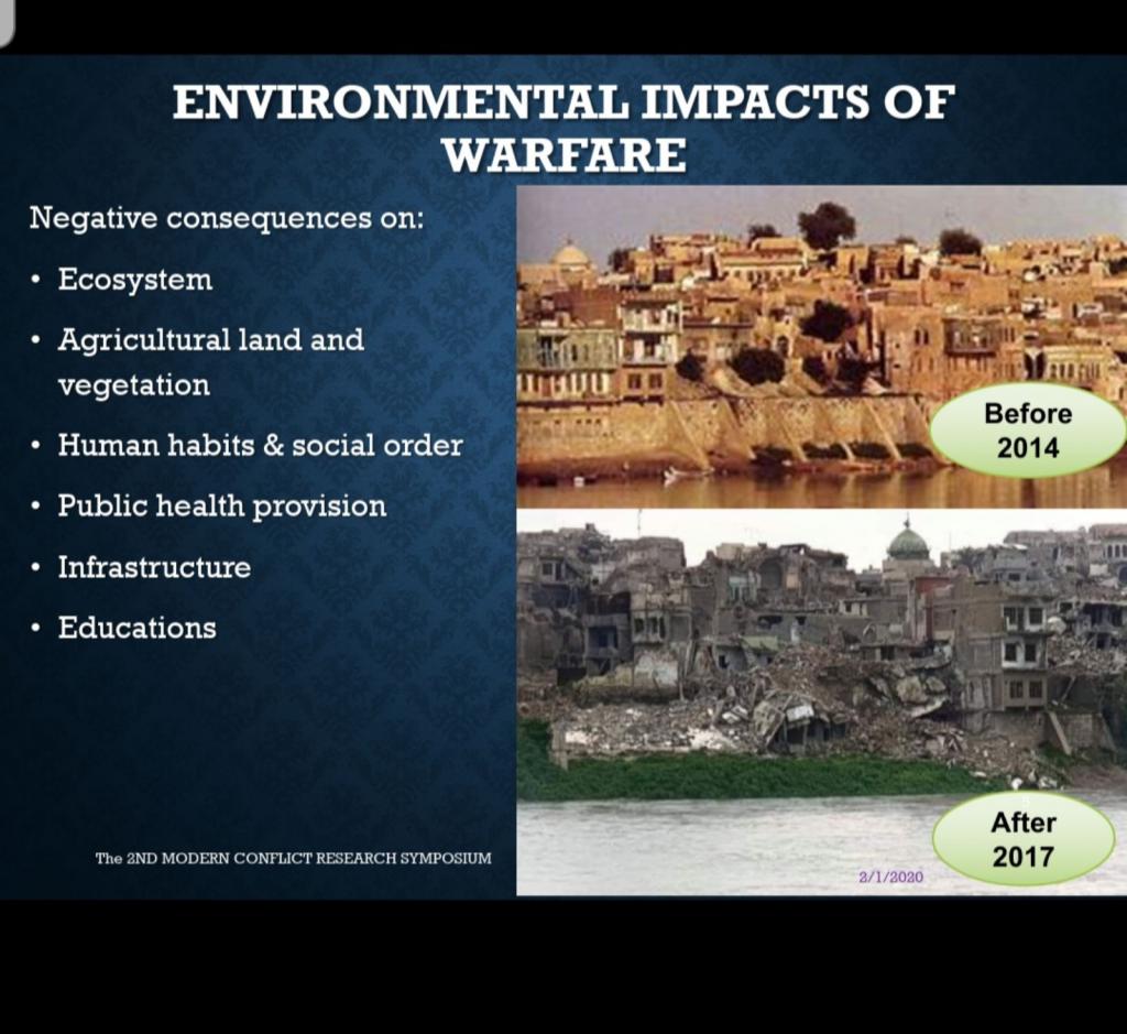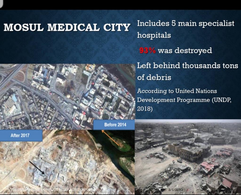 شارك الأستاذ المساعد الدكتور رياض عبدالله الطائي في أعمال المؤتمر العلمي الدولي الثاني حول الصراعات والحروب الحديثة المنعقد في جامعة هيدرسفيليد / مانشستر – المملكة المتحدة ، وذلك لعرض ورقة بحثية حول الصراعات والحروب التي مرت على مدينة الموصل ، مع مناقشة الآراء والحلول المطروحة لمعالجة تلك المشاكل البيئية وتقليل أضرار التلوث البيئي على الصحة العامة ، وقد نال البحث الاهتمام الكبير من قبل المشاركين وإدارة المؤتمر وحصل على شهادة التميز من بين البحوث والدراسات المشاركة وعددها حوالي 45 ورقة بحثية, متمنين لأستاذنا الفاضل المزيد من النجاحات والتألق في مسيرته العلمية.