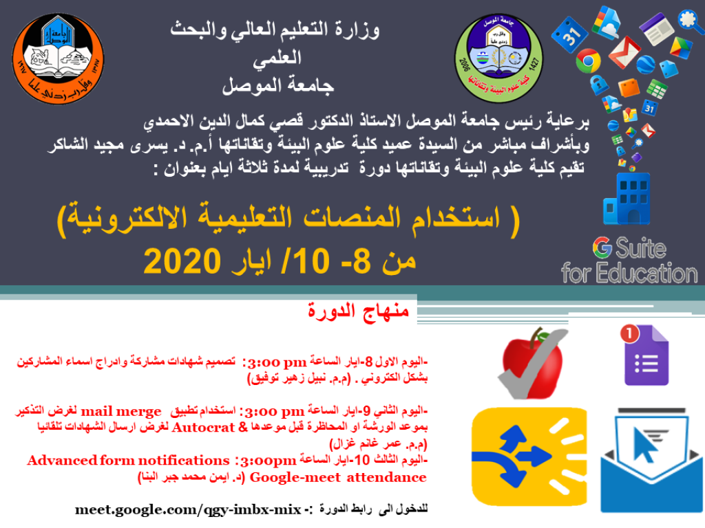 برعاية رئيس جامعة الموصل الاستاذ الدكتور قصي كمال الدين الاحمديوبأشراف مباشر من السيدة عميد كلية علوم البيئة وتقاناتها الاستاذ المساعد الدكتور يسرى مجيد الشاكرتقيم كلية علوم البيئة وتقاناتها دورة تدريبية لمدة ثلاثة ايام بعنوان :( استخدام المنصات التعليمية الالكترونية)من يوم الجمعة المصادف 8- 10/ ايار 2020رابط الدخول للدورةhttps://meet.google.com/qgy-imbx-mix