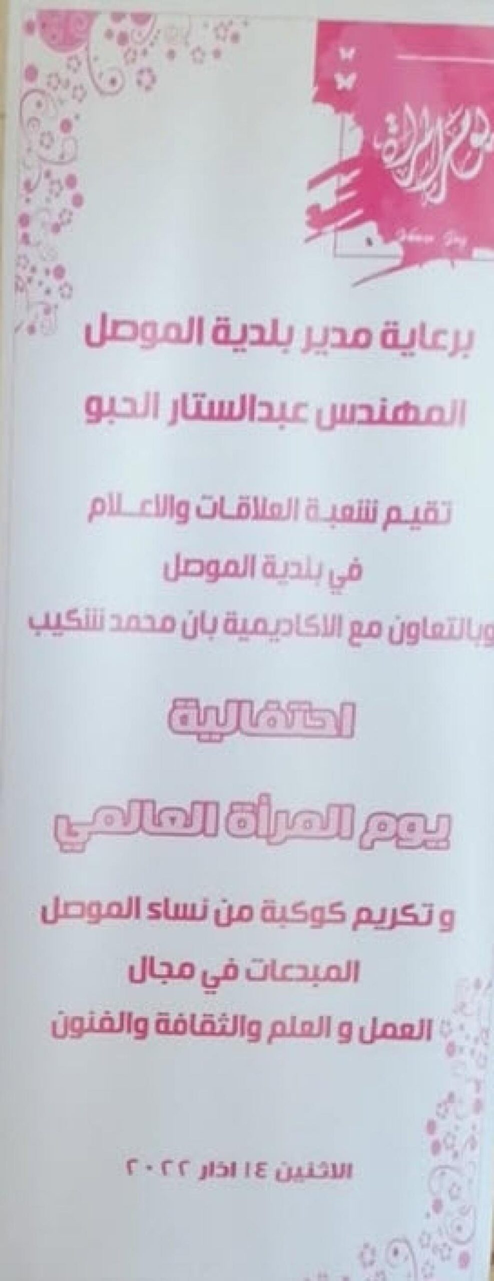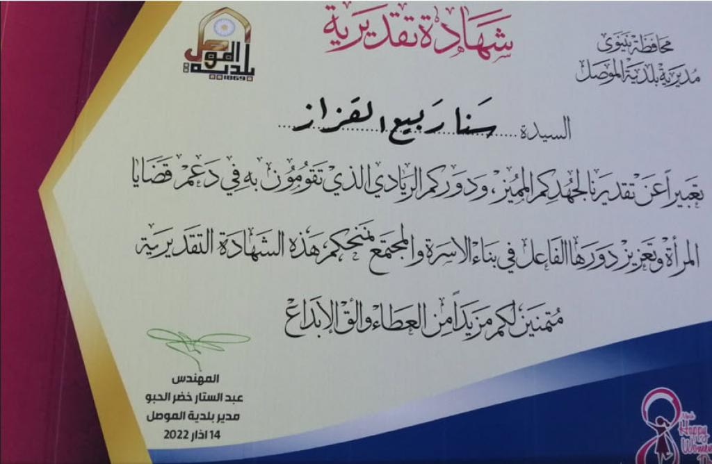 تم يوم الاثنين الموافق 14 اذار 2022 تكريم السيدة ((سنا ربيع القزاز)) التدريسية في كلية علوم البيئة وتقاناتها كأول موصلية تفتح مكتبة عامة مخصصة للاطفال في مدينة الموصل وذلك ضمن حفل لمناسبة يوم المرأة العالمي والذي اقامته الاكادمية العازفة “بان محمد شكيب” وبرعاية بلدية الموصل وجاء التكريم لعدد من الشخصيات الموصليات البارزات في مجالات مختلفة.شعبة الاعلام والعلاقات العامة