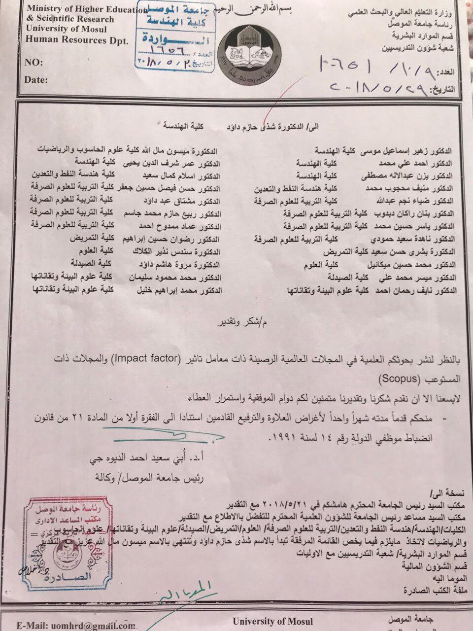 تثمينا للجهود التي بذلها كل من الدكتور نايف رحمان احمد والدكتور محمد محمود سليمان والدكتور محمد إبراهيم خليل في نشر بحوثهم في مجلات علمية عالمية رصينة ذات معامل تأثير (lmpact factor ) والمجلات ذات المستوعب (Scopus) فقد وجه السيد رئيس جامعة الموصل الأستاذ الدكتور أبي سعيد الديوه جي كتاب شكر وتقدير ،وبدور عمادة كلية علوم البيئة وتقاناتها متمثلة بالسيد العميد المحترم الأستاذ الدكتور قصي كمال الدين الأحمدي وبأسم كافة منتسبي الكلية بالتهاني متمنين لأساتذتنا الأفاضل مزيدا من التقدم والرقي لرفع المكانة العلمية لجامعتنا العزيزة