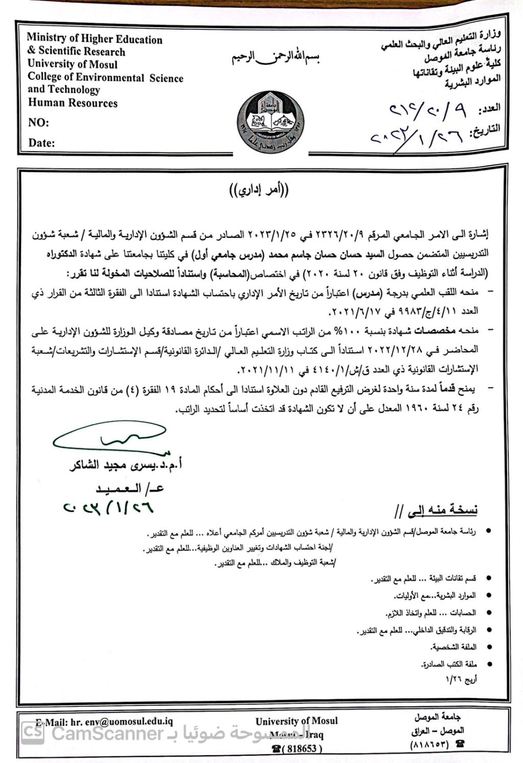 تهنئة…تتقدم عمادة كلية علوم البيئة وتقاناتها متمثلة بالسيدة عميد الكلية الاستاذ المساعد الدكتورة يسرى مجيد الشاكر بالتهنئة للدكتور حسان حسان جاسم محمد لصدور الامر الجامعي بمنحه شهادة الدكتواره بتخصص علوم التصرف المحاسبة تخصص محاسبة التكاليف البيئية من جامعة منوبة المعهد العالي للمحاسبة وإدارة المؤسسات/ تونس. متمنين له المزيد من العطاء والتقدم. الف مبروك.شعبة الاعلام والعلاقات العامة