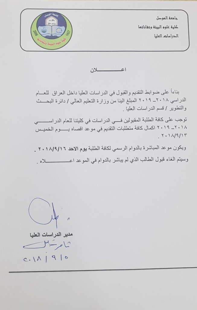 ستقوم جامعة الموصل بعمل تطوعي وجمع التبرعات لشراء الماء النقي لاهلنا في البصرة وعليه نهيب بمنتسبينا المشاركة بالتبرع ،وعلى الراغبين تسجيل الأسماء ومقدار المبلغ لدى السادة رؤساء الاقسام العلمية المحترمين والمعاون الاداري المحترم وكل حسب عائديته
