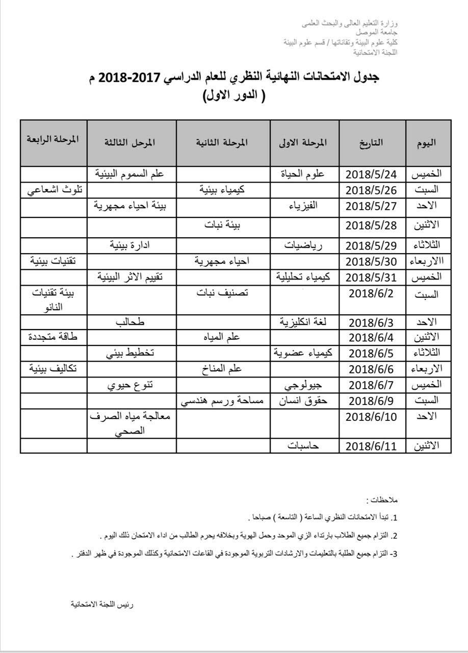 ادناهجدول الامتحانات النهائية النظري للعام الدراسي 2017-2018 لقسمي علوم البيئة وتقانات البيئةــ قسم علوم البيئة