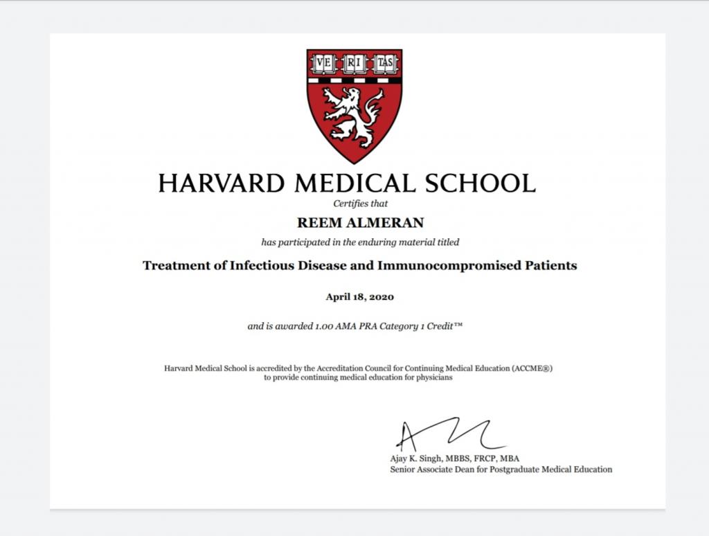 ضمن اطار النشاطات العلمية لتدريسي كلية علوم البيئة وتقاناتها حصلت السيدة ريم إياد طلعت مدرس مساعد في قسم علوم بيئة على شهادة مشاركة في الدورة التدريبية بعنوانTreatment of Infectious Disease and Immunocompromised Patientsالجهة المانحة للشهادة Harvard Medical school