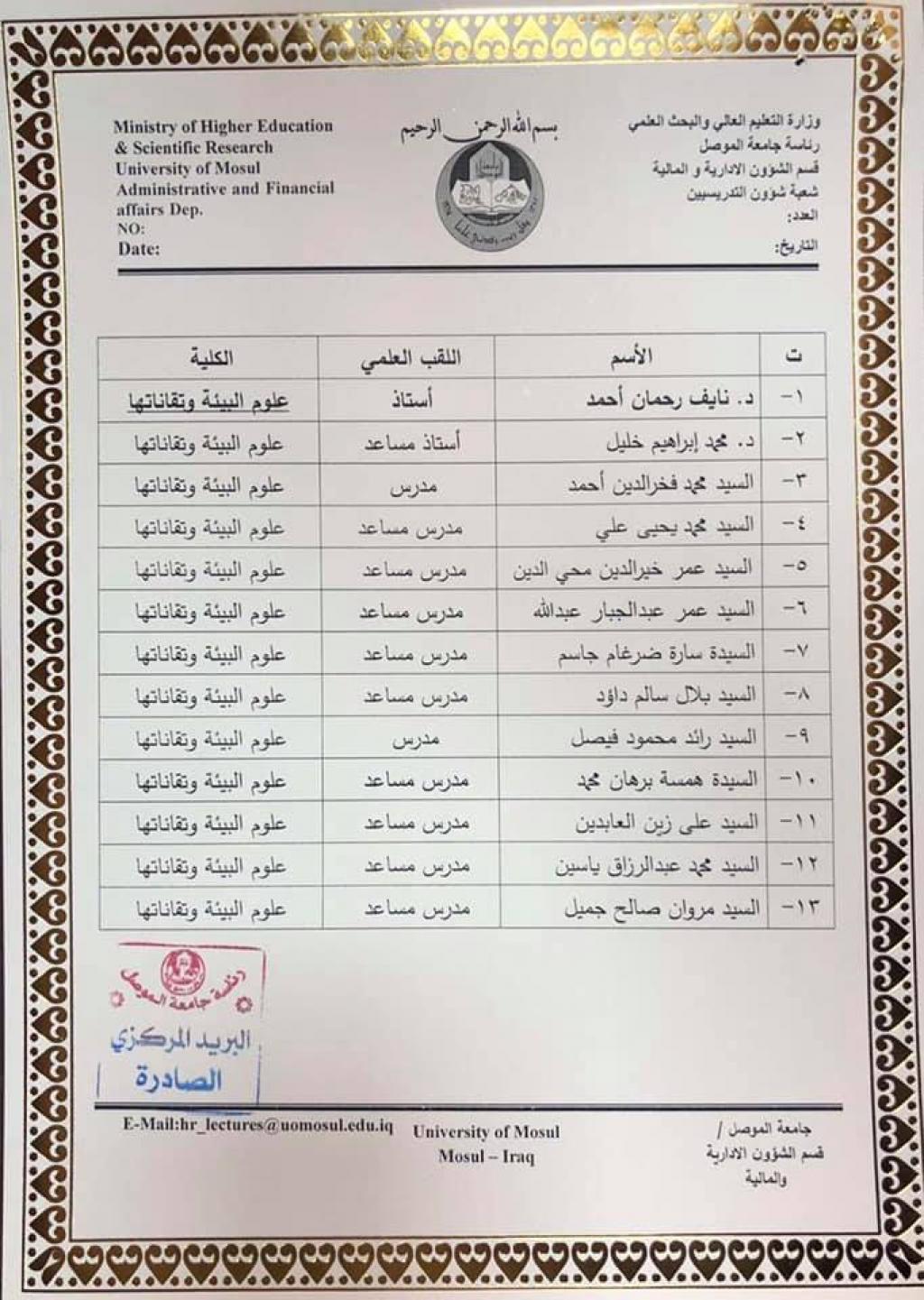 حصول عدد من تدريسي كلية علوم البيئة وتقاناتها على كتاب شكر وتقدير من السيد رئيس جامعة الموصل