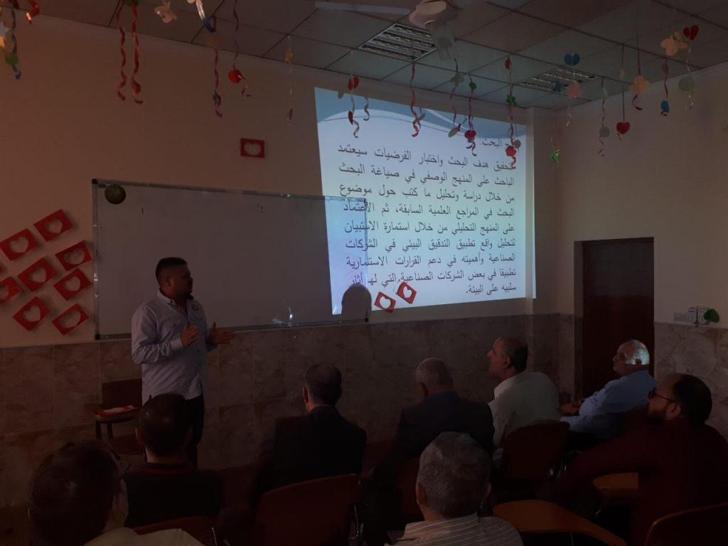 ضمن سلسلة الفعاليات العلمية المقامة في قسم التقانات أدار التدريسي حسان حسان جاسم حلقتين دراسيتين الأولى كانت بعنوان (دور التدقيق البيئي في تحسين جودة القرارات الأستثمارية دراسة أستطلاعية في عينة من الشركات ) . والحلقة الثانية بعنوان (دور المحاسبة القضائية في مكافحة الفساد المالي دراسة إستطلاعية في محاكم نينوى ) مضيفا أن عقد الحلقة يأتي ضمن نشاطات الكلية المتعلقة بالتثقيف في مجال العمل الوظيفي وإشاعة ثقافة النزاهة والوصول الى فكر إداري ناجح من شأنه تقويم النظام الأداري في العراق . كما أوضح أن لأئحة السلوك الوظيفي تعد من اللوائح المهمة وخارطة طريق تحدد واجبات الموظف الأيجابية والسلبية التي يجب عليه أن يؤديها داخل المؤسسة التي يعمل فيها والتي يجب أن يوقع عليها الموظف ،مشيرا إلى ان هذه الأجراءات سوف ترصن الواجبات لدى الموظف والألتزام بها أثناء مسيرته في العمل الوظيفي مؤكدا أن الموظف إذا ما أدخل بتلك الواجبات سيعرض نفسه لعقوبات موجودة في القوانين العامة ، وبين أن عقد مثل هذه الحلقة الدراسية تكسب الموظفين المعلومات القانونية الخاصة في ميدان سلوكيات العمل الوظيفي والحقوق والواجبات لكي يحصنوا أنفسهم قانونيا وإشاعة قيم النزاهة والسلوك القويم فضلا عن إنجاح العملية الأدارية وتذليل جميع العقبات التي من شأنها أن تعطي مسارا إيجابيا للعملية التعليمية