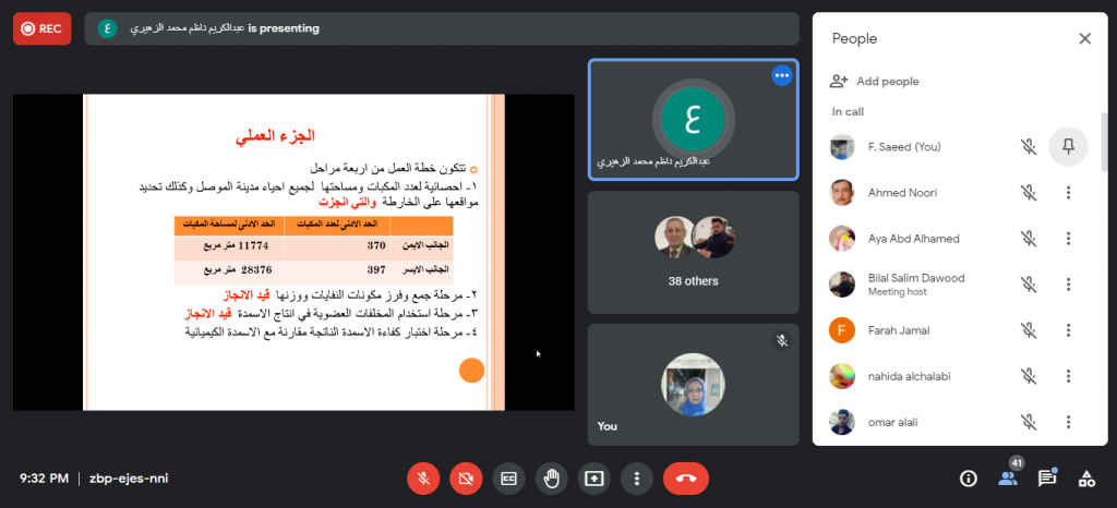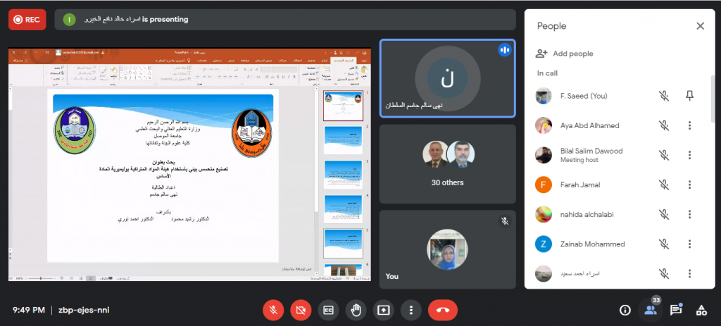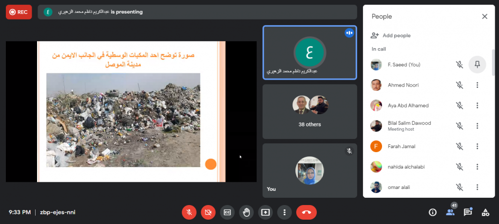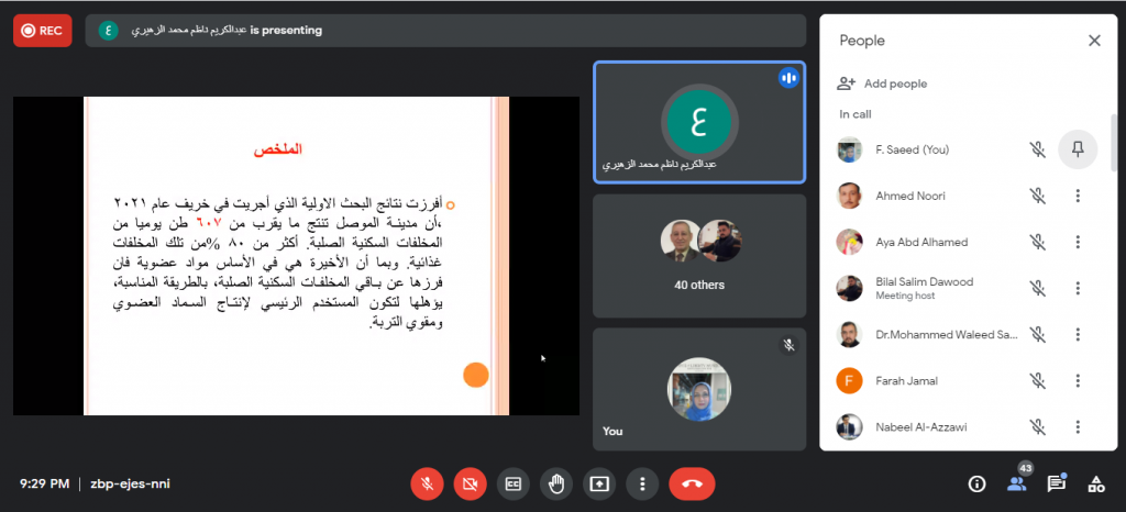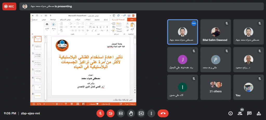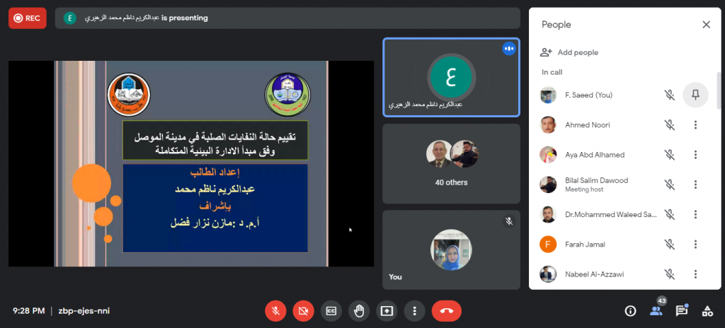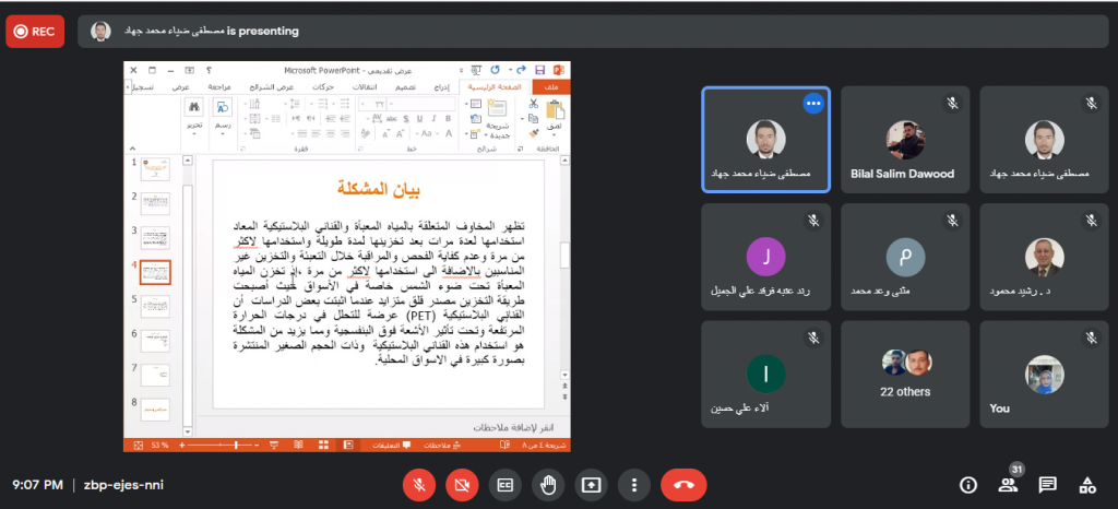 جرت مساء يوم الثلاثاء الموافق 30 تشرين الثاني 2021م حلقة نقاشية لطلبة الدراسات العليا في كلية علوم البيئة وتقاناتها وبحضور السيد رئيس قسم علوم البيئة والسادة اساتذة القسم. حيث قام الطالب مصطفى ضياء محمد بعرض مقترح بحثه الموسوم “تأثير اعادة استخدام القناني البلاستيكية لأكثر من مرة على تراكيز الجسيمات البلاستيكية في المياه” بإشراف الاستاذ الدكتور قصي كمال الدين الاحمدي يهدف بحثه الى دراسة الخصائص الفيزيائية والبكتريولوجية لأصناف المياه المعبأة المستخدمة لأكثر من مرة اضافة الى دراسة تأثير مدة وظروف التخزين على الخصائص اعلاه وتأثيرها على صحة وسلامة الانسان . عرض بعده الطالب عبد الكريم ناظم محمد مقترحه حول البحث الموسوم “تقييم حالة النفايات الصلبة في مدينة الموصل وفق مبدأ الادارة البيئية المتكاملة” بإشراف الاستاذ المساعد الدكتور مازن نزار فضل والذي يهدف الى دراسة وتقييم حالة النفايات الصلبة في مناطق مختارة من مدينة الموصل بجانبيها الايمن والايسر. واختتمت الحلقة النقاشية بالطالبة نهى سالم جاسم حيث قدمت عرض لما ستقوم به خلال بحثها الموسوم “تصنيع متحسس بيئي باستخدام هيئة المواد المتراكبة بوليميرية المادة الاساس” بإشراف الاستاذ الدكتور رشيد محمود والاستاذ المساعد الدكتور احمد نوري والذي يهدف الى تصميم مستشعر بيئي قادر على تحسس ملوثات بيئية محددة مثل اول اوكسيد الكاربون، ثاني اوكسيد الكاربون وكبريتيد الهيدروجين بالية بسيطة يمكن استخدامها لعامة الناس . استمع الطلبة الى نصائح وملاحظات الاساتذة الحاضرين التي اغنتهم بالمعلومات القيمة للاستفادة منها في انجاز بحوثهم.شعبة الاعلام والعلاقات العامة