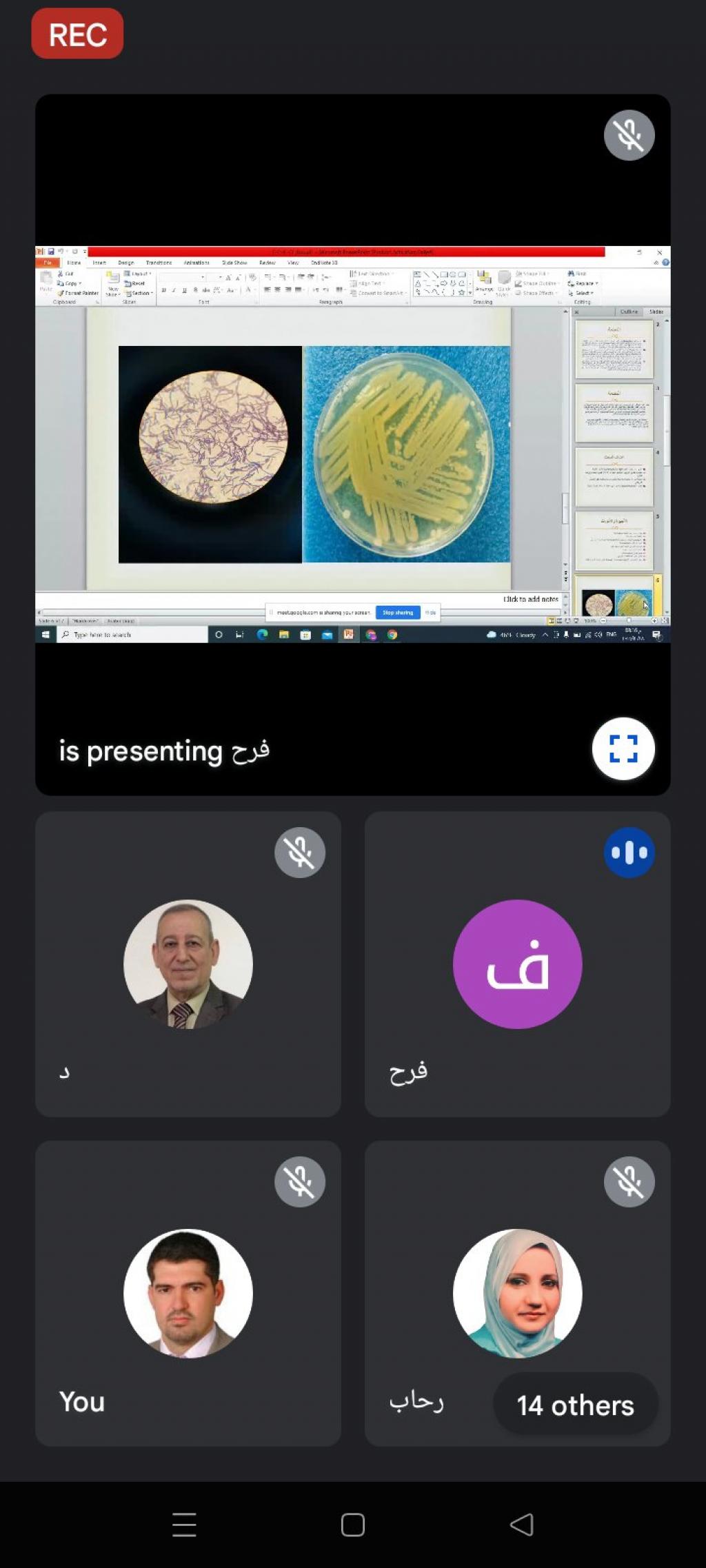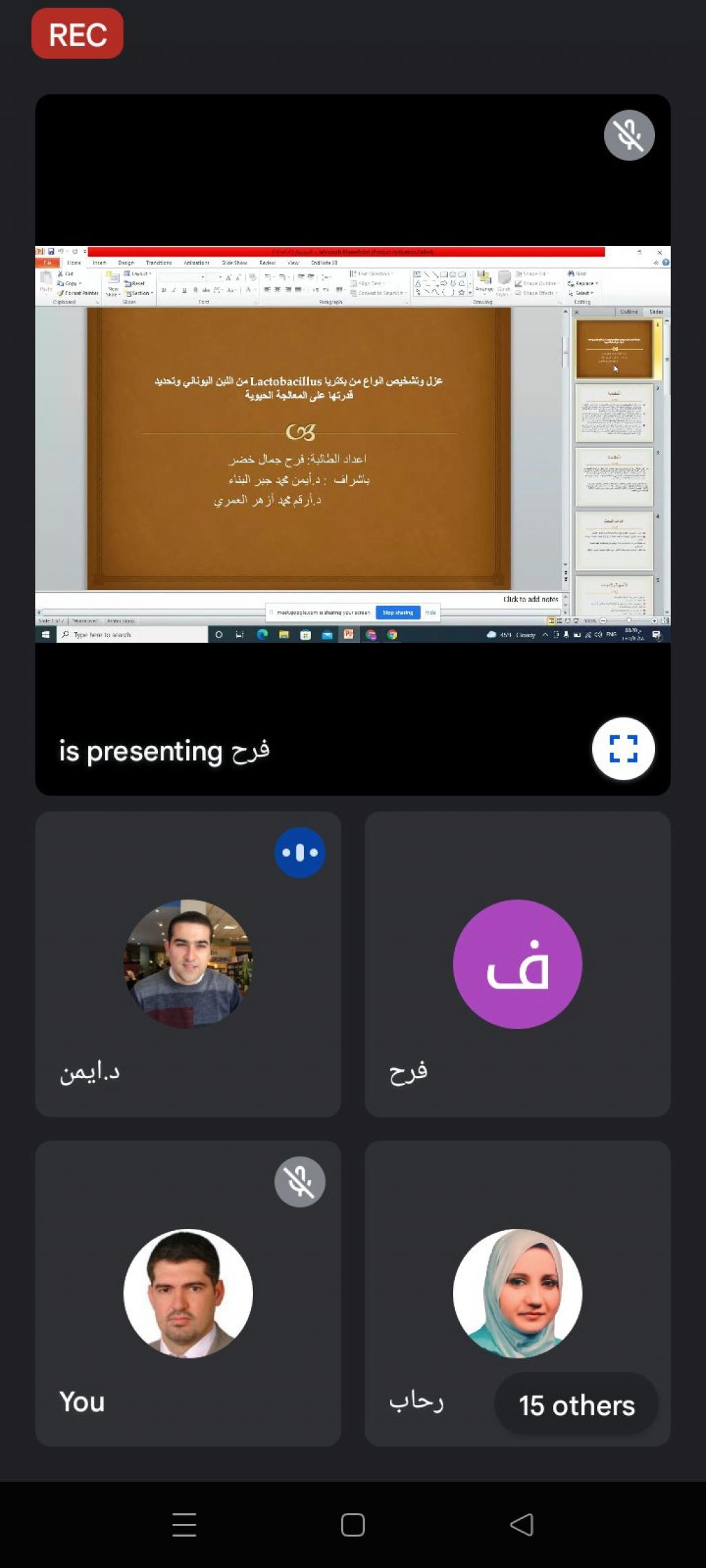 جرت مساء يوم الثلاثاء الموافق 28 كانون الاول 2021م حلقة نقاشية لطلبة الدراسات العليا في كلية علوم البيئة وتقاناتها وبحضور السيد رئيس قسم علوم البيئة والسادة اساتذة القسم. حيث قامت الطالبة فرح جمال خضر بعرض مقترح بحثها الموسوم ” عزل وتشخيص انواع من بكتريا Lactobacillus من اللبن اليوناني وتحديد قدرتها على المعالجة الحيوطية”باشراف : د.أيمن محمد جبر البناء و د.أرقم محمد أزهر العمري، هدف البحث الى عزل وتشخيص لبكتريا Lactobacillus Spp بالطرق التقليدية واستخدام الطرق الجزئيئة باستخدام تقنية الـ PCR لتحديد الجينات الرئيسة للبكتريا واستخلاص الـ Bacteriocin وتحديد نوعة باستخدام تقنية الفصل البروتينيب بالاضافة الى اختبار الـ Bacteriocin لاختباره في امكانية المعالجة الحيوية والبيئية..قدمت بعدها الطالبةرنين محمد يحيى سليمانمقترح حول البحث الموسوم ” تطوير استخدام دواء لتقدير عنصر الحديد في بعض النماذج البيئية ” بإشرافأ.د نايف رحمان احمدوالذي يهدف الى تجربة بعض الادوية واستخدامها ككواشف كروموجينية لتقدير بعض الفلزات الثقيلة والتطبيق على نماذج بيئية مختلفة وكذلك استخدام هذا التفاعل لتقدير عناصر اخرى بشكل غير مباشر وايضا التطبيق على نماذج بيئية مختلفة حيث تعتمد هذه الطريقة على تكوين متراكب احمر برتقالي اللون بين الحديد والمركب المخلبي وهذه الطريقة حساسة جدا لتعيين الحديد. واستمع الطلبة الى نصائح وملاحظات الاساتذة الحاضرين التي اغنتهم بالمعلومات القيمة للاستفادة منها في انجاز بحوثهم.شعبة الاعلام والعلاقات العامة