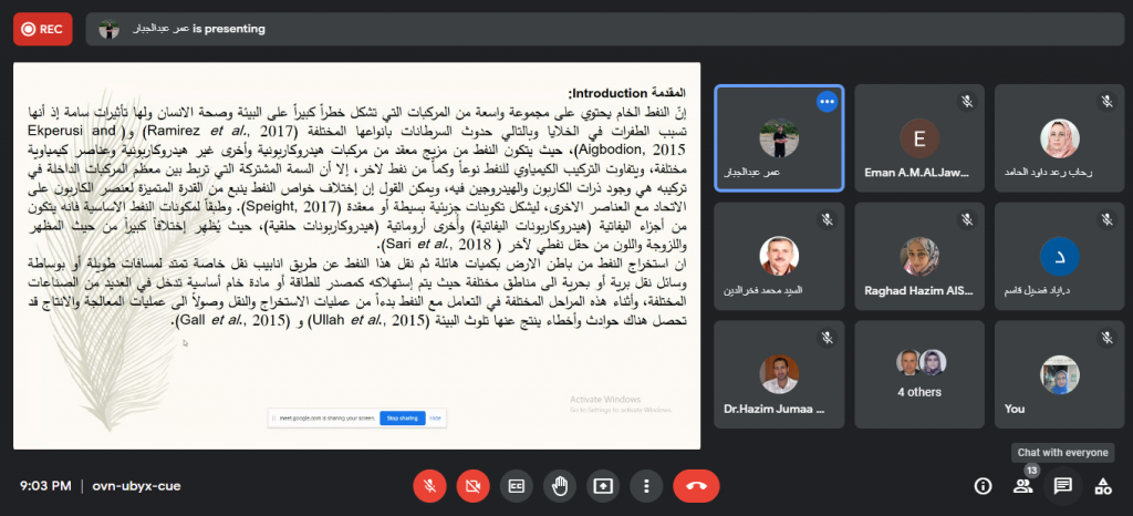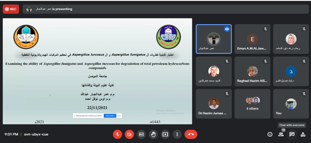 ضمن النشاطات العلمية لقسم تقانات البيئة للعام الدراسي 2021-2022 م ، عقدت حلقة نقاشية بعنوان ” اختبار قابلية فطريات الـ Aspergillus fumigatus و الـ Aspergillus turcosus في تحطيم المركبات الهيدروكاربونية النفطية” القى فيها م.م. عمر عبد الجبار مختصر لمقترح بحث مزمع انجازه ضمن الخطة البحثية للقسم استعرض فيها المحاضر اهداف الدراسة وطرق انجازها. تهدف هذه الدراسة إلى التحري عن قابلية فطر Aspergillus fumigatus و Aspergillus turcosus في تحليل المركبات الهيدروكاربونية للنفط الخام وتأثير عامل الزمن على ذلك وبالتالي إمكانية استخدام قدرة الفطريات هذه في المعالجة الحيوية للمواقع الملوثة بالنفط الخام مستقبلا. في الختام ناقش الحضور بعض الجوانب التي تطرق اليها البحث وقدموا بعض المقترحات التي تم تخذها بنظر الاعتبار من قبل الباحث.شعبة الاعلام والعلاقات العامة