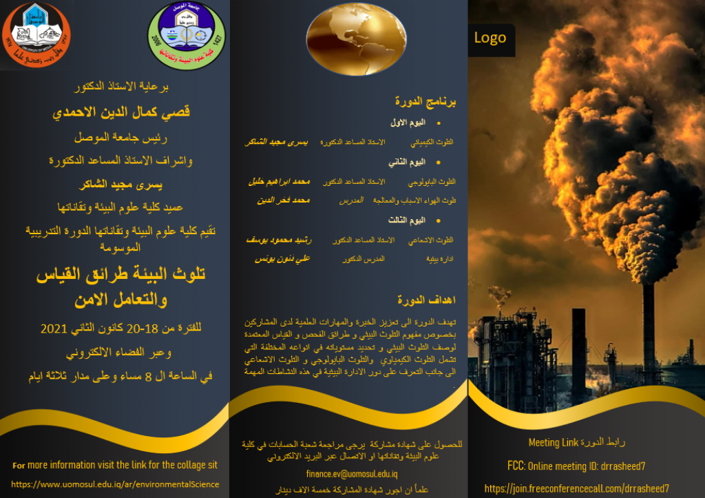 ضمن اطار نشاطات كلية علوم البيئة وتقاناتها وتنفيذا لتوجيهات السيد رئيس جامعة الموصل الاستاذ الدكتور قصي كمال الدين الاحمديواشراف مباشرمن قبل السيد عميد الكلية الاستاذ المساعد الدكتورة يسرى مجيد الشاكر تقيم كلية علوم البيئة وتقاناتها الدورة التدريبية الموسومةتلوث البيئة طرائق القياس والتعامل الامنللفترة من 18-20 كانون الثاني 2021وعبر الفضاء الالكتروني وفي تمام الساعة ال 8 مساء وعلى مدار ثلاثة ايام.Meeting Link رابط الدورةFCC: Online meeting ID: drrasheed7https://join.freeconferencecall.com/drrasheed7للحصول على شهادة مشاركة يرجى مراجعة شعبة الحسابات في كلية علوم البيئة وتقاناتها او الاتصال عبر البريد الالكتروني[email protected]علماً ان اجور شهادة المشاركة خمسة الاف دينار