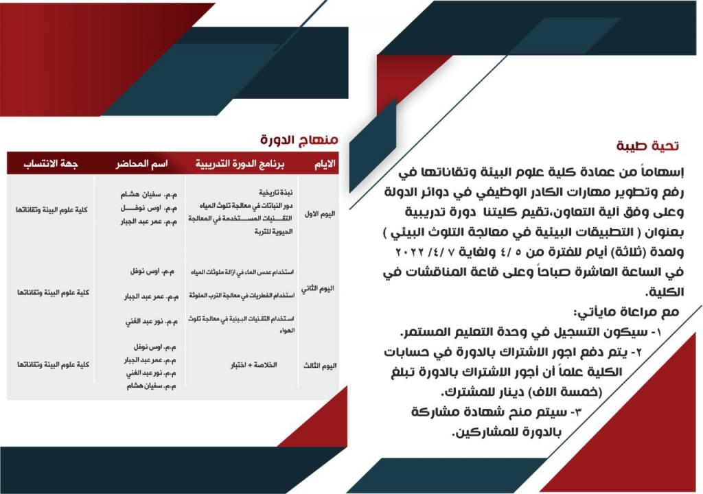 برعاية الاستاذ الدكتور قصــي كمــال الديــن الاحمــدي رئيس جامعة الموصل وباشراف الاستاذ المساعد الدكتورة يـسرى مجيـد الشـاكر عميد كلية علوم البيئة وتقاناتها وضمن نشاطات وحدة التعليم المستمر تقييم كلية علوم البيئة وتقاناتها دورة تدريبية بعنوان((التطبيقات البيئية في معالجة التلوث البيئي))ولمدة ثلاثة أيام للفترة من 5 /4 ولغاية 7 /4/ 2022 في تمام الساعة العاشرة صباحاً وعلى قاعة المناقشات في الكلية.مع مراعاة مايأتي:1- سيكون التسجيل في وحدة التعليم المستمر.2- يتم دفع اجور الاشتراك بالدورة في حسابات الكلية علماً أن أجور الاشتراك بالدورة تبلغ (خمسة الاف) دينار للمشترك.3- سيتم منح شهادة مشاركة بالدورة للمشاركين.شعبة الاعلام والعلاقات العامة