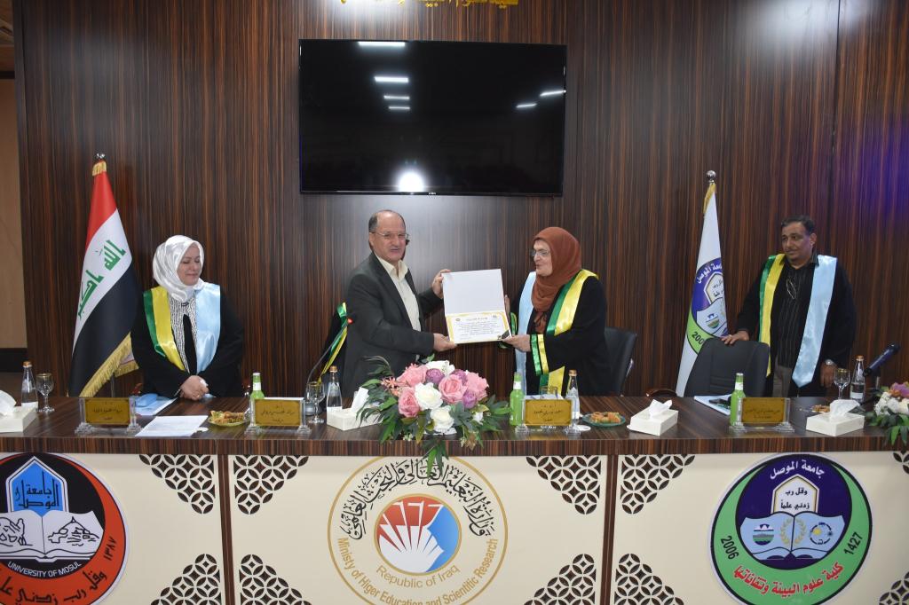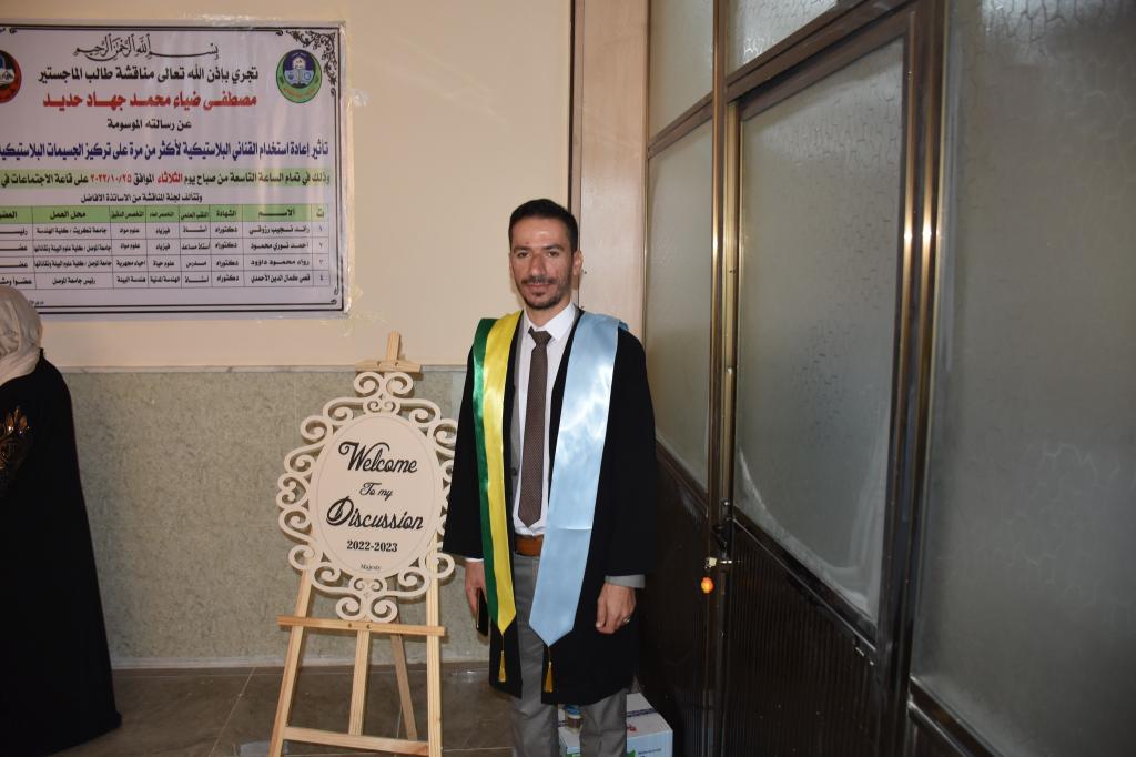 باشراف وعضوية الاستاذ الدكتور قصي كمال الدين الاحمدي/ رئيس جامعة الموصل وبحضور السيدة عميد الكلية الاستاذ المساعد الدكتورة يسرى مجيد الشاكر جرى صباح اليوم الثلاثاء 25 تشرين الاول 2022 مناقشة رسالة الماجستير للطالب مصطفى ضياء محمد حديد الموسومة ((تأثير اعادة استخدام القناني البلاستيكية لاكثر من مرة على تركيز الجسيمات البلاستيكية في المياه )).تناولت الدراسة تأثير اعادة استخدام القناني البلاستيكية على المياه وخصائص البلاستك الجزيئية التي تتغير بِشَكل طفيف إذا ما تعرضت لِظُروف معينة مما يؤدي إلى تحللها إلى جسيمات صغيرة ودقيقة تنتشر في المياه التي تحتويه.هدفت الدراسة الى التحقق من وجود جسيمات بلاستيكية دقيقة في القناني البلاستيكية المعبأة بالمياه المستخدمة لأول مرة ومستويات الجسيمات البلاستيكية عند كل إعادة استخدام ودراسة تأثير ظروف الخزن المختلفة عَلّى التلوث البكتيري للمياه المعبأة في القناني البلاستيكية. بالاضافة الى تقييم مستويات التلوث البكتيري للقناني البلاستيكية المعاد إستِخدامها لعدة مرات من قبل المستهلكين.ترأس لجنة المناقشة الاستاذ الدكتور رائد نجيب رزوقي/ جامعة تكريت/ كلية الهندسة وعضوية كل من الاستاذ المساعد الدكتور احمد نوري محمود والدكتورة رواء محمود داؤود.حضر المناقشة السيد معاون العميد للشؤون العلمية الدكتور علي بشير عزيز والسيدة معاون العميد للشؤون الادارية الدكتورة شيماء خليل عبد الله وعدد من اساتذة وطلبة الكلية.وفي ختام المناقشة قدمت السيدة عميد الكلية شهادة تقديرية للاستاذ الدكتور رائد نجيب رزوقي لتجشمه عناء السفر والمشاركة في مناقشة الطالب متمنين لهم المزيد من العطاء والتقدم. الف مبروك للطالب وللجنة المناقشة.شعبة الاعلام والعلاقات العامة