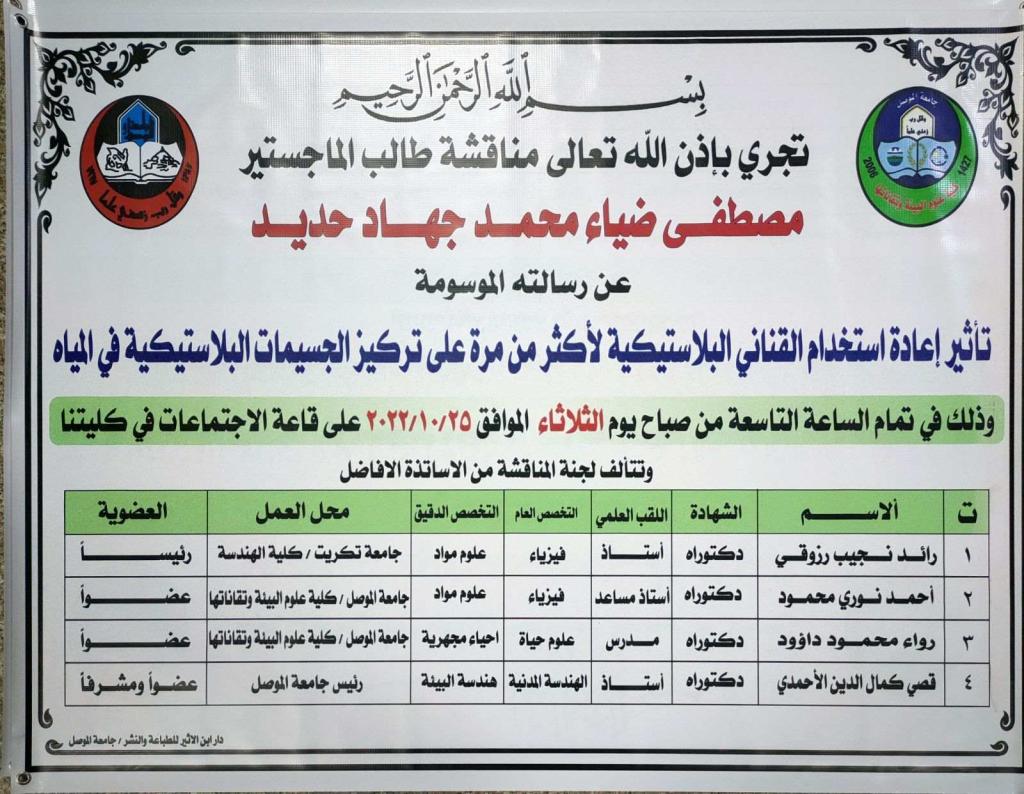 رسالة ماجستير تناقش تأثير اعادة استخدام القناني البلاستيكية في كلية علوم البيئة وتقاناتها…