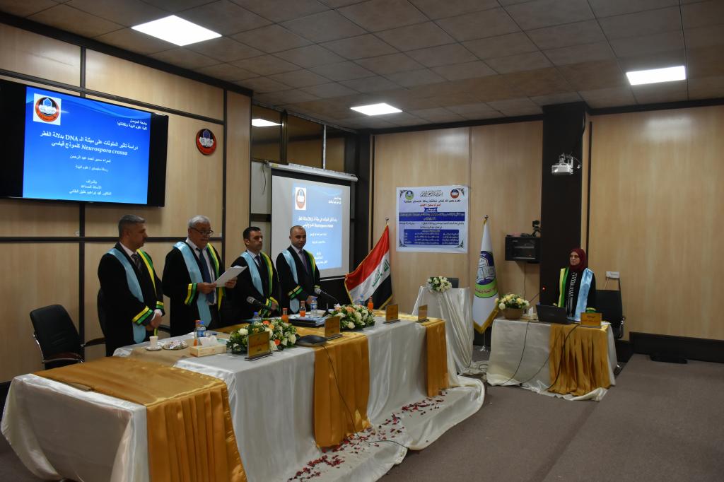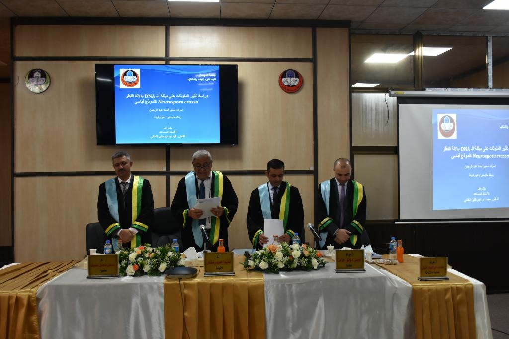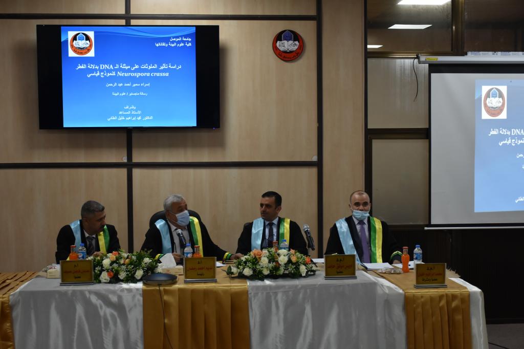 بعضوية واشراف الاستاذ المساعد الدكتور محمد ابراهيم خليل ناقشت كلية علوم البيئة وتقاناتها رسالة الماجستير للطالبة اسراء سمير احمد والموسومة “دراسة تأثير الملوثات على ميثلة الـ DNA بدلالة الفطر Neurospora crassa كنموذج قياسي”” وذلك في صباح يوم الثلاثاء الموافق 13 تشرين الاول ٢٠٢٠ وعلى قاعة الاجتماعات في كلية علوم البيئة وتقاناتها وبحضور السيد معاون العميد للشؤون العلمية.تناول البحث دراسة تاثير الفوفورال والتدخين علىDNA الفطر Neurospora crassa الذي استخدم كنموذج قياسي في جميع التجارب وكذلك تم دراسة تاثير الاشعة فوق البنفسجية بوجود العناصر الثقيلة على الفطرهدف البحث الى دراسة تأثير بعض العوامل البيئية والكيمائية على عملية ميثلة DNA باستخدام الفطر Neurospora crassa, وتوضيح التداخل ومعرفة تأثير بعض مضادات الأكسدة مثل الشاي بنوعيه الأسود والأخضر على العوامل البيئية والمواد الكيمائية.كذلك دراسة التأثيرات الحاصلة نتيجة العوامل البيئية والمواد الكيمائية على مستوى الحامض النووي منقوص الأوكسجين (DNA) الذي يعد مخزون المعلومات في الكائنات الحية والذي يتحكم بصفات الفرد والتعبير الجيني .وبعد مناقشة الطالبة والاستماع الى دفاعها عن رسالتها قررت لجنة المناقشة قبول الرسالة ومنح الطالبة شهادة الماجستير وبتقدير امتياز.اعلام كلية علوم البيئة وتقاناتها
