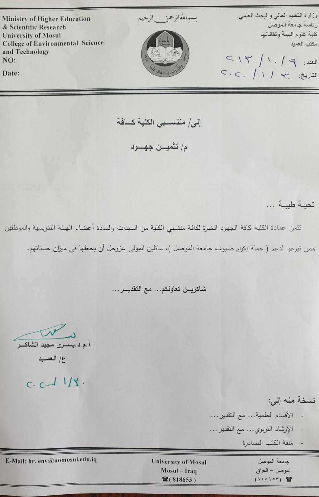وجهت السيدة عميد الكلية الأستاذ المساعد الدكتورة يسرى مجيد شهاب الشاكر بأسمها وأسم عمادة الكلية كتاب شكر وتقدير إلى منتسبي الكلية تثمينا للجهود المبذولة والتي تجسدت في المساهمة ودعم حملة إكرام ضيوف جامعة الموصل من طلبة الأقسام الداخلية متمنيةً لكافة المنتسبين المزيد من العطاء والتوفيق والسداد في بذل المزيد من العطاء.
