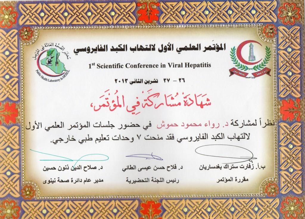 منحت الدكتورة رواء محمود حموشي شهادة مشاركة في المؤتمر العلمي الاول لالتهاب الكبد الفايروسي ..