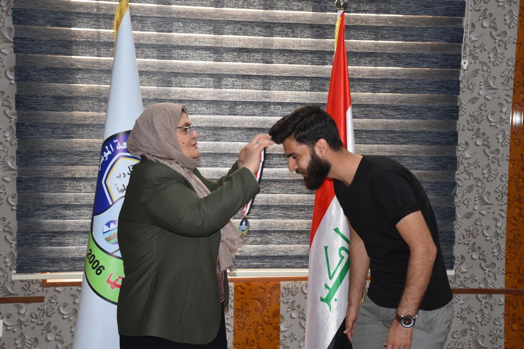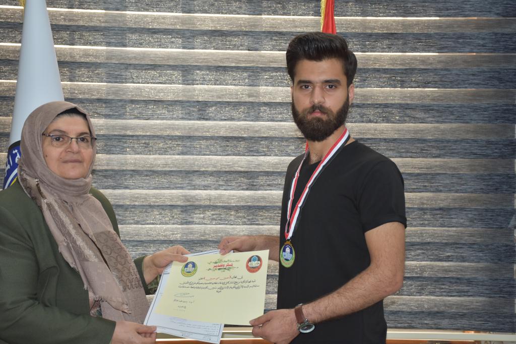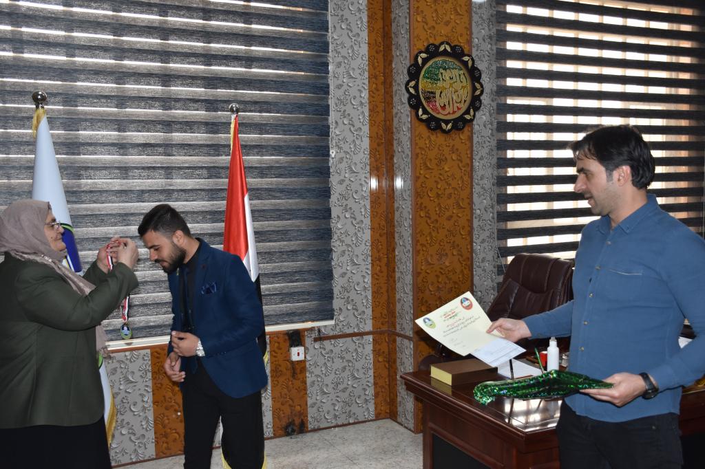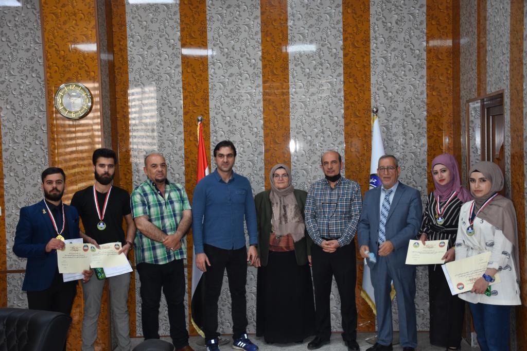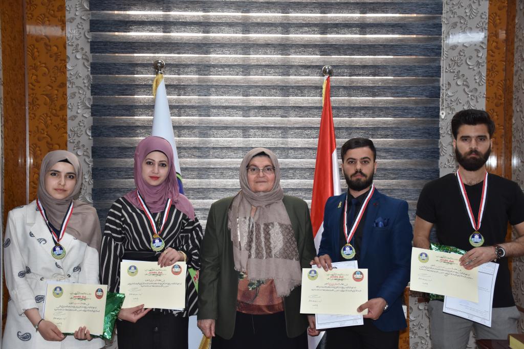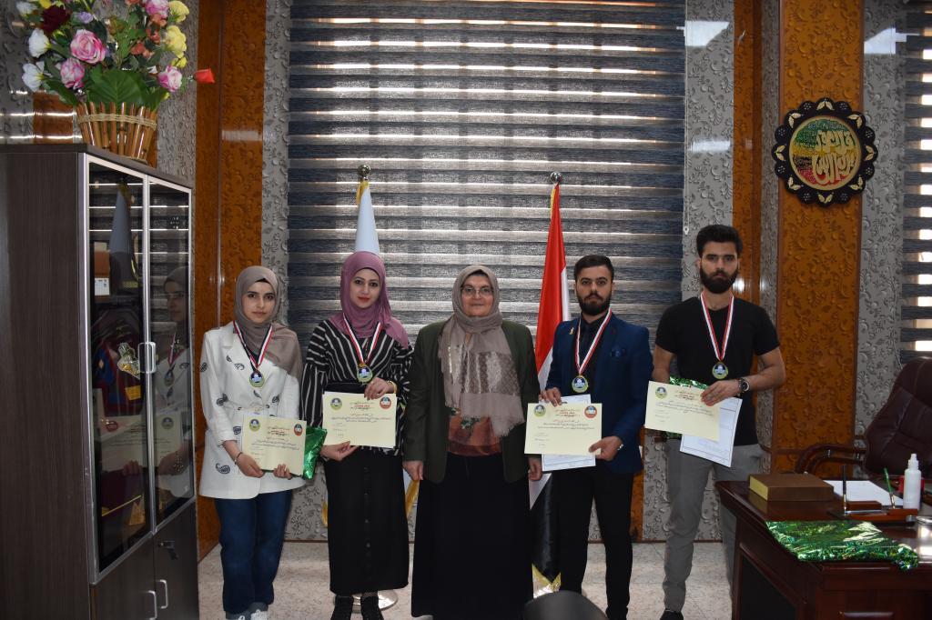 تكريم عدد من الطلبة المتميزين في كلية علوم البيئة وتقاناتها الذين مثلو الكلية باجمل صورة في الفعاليات والمسابقات على مستوى جامعة الموصل.قامت عمادة علوم البيئة وتقاناتها متمثلة بالسيدة عميد الكلية الدكتورة يسرى مجيد الشاكر اليوم الثلاثاء 20 نيسان 2021 بتكريم عدد من الطلبة الذين حققو انجازات رائعة في المسابقات على مستوى الجامعة وهم كل منالطالب (مصطفى علي صالح) مرحلة ثالثة قسم علوم البيئة على النشاطات التي يقدمها والعمل الكبير ورفع اسم الكلية في جميع المحافل الجامعية .تكريم الطالبة (نبأ احمد مولود) مرحلة ثانية قسم علوم البيئة بعد حصولها على المركز الثاني في (ماراثون عيد الجامعة) وهو يعد انجاز كبير ونتمنى لها التقدم المستمر والمزيد من العطاء .تكريم الطالب (حسين سمير حسين) مرحلة ثالثة قسم تقانات البيئة بعد الحصول على المركز الأول على مستوى الجامعة في مسابقة الرسم التي نظمتها رئاسة الجامعة.تكريم الطالبة (نور علي نجم الدين) مرحلة رابعة قسم تقانات البيئة بعد الحصول على المركز الخامس على مستوى الجامعة في مسابقة الرسم التي نظمتها رئاسة الجامعة.حيث قدمت السيدة العميدة الجوائز والشهادات التقديرية للطلبة بحضور السادة المعاون الاداري, ورئيس قسم العلوم ومسؤول النشاطات الطلابية ومدير الادارة.نتمنى كل التوفيق لطلبتنا والاستمرار بالأبداع ورفع اسم الكلية والجامعة في جميع المحافل.شعبة الاعلام والعلاقات العامة.