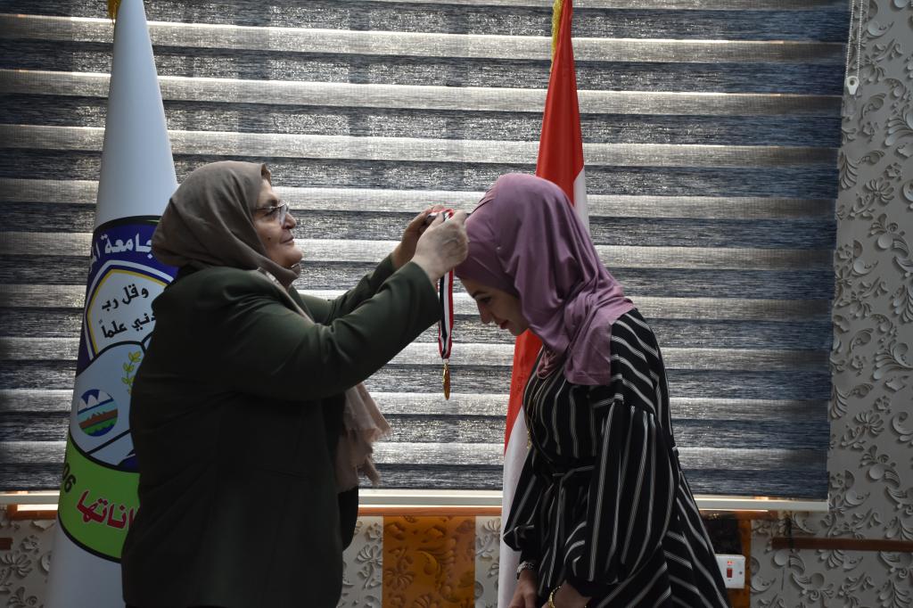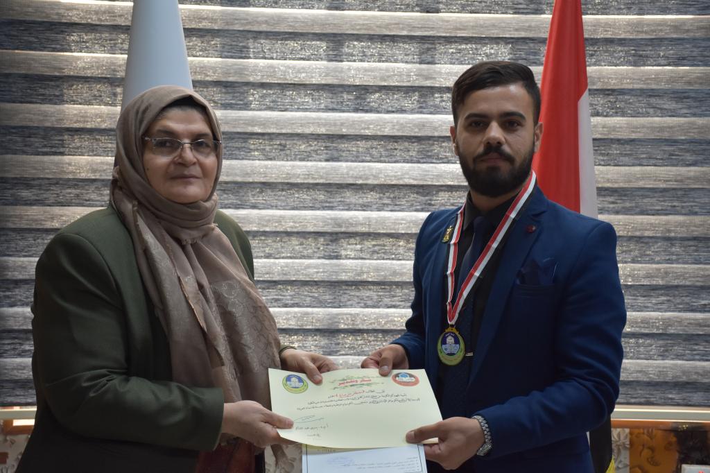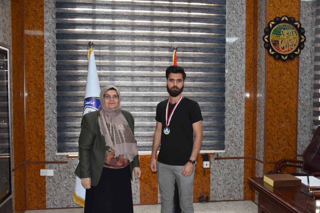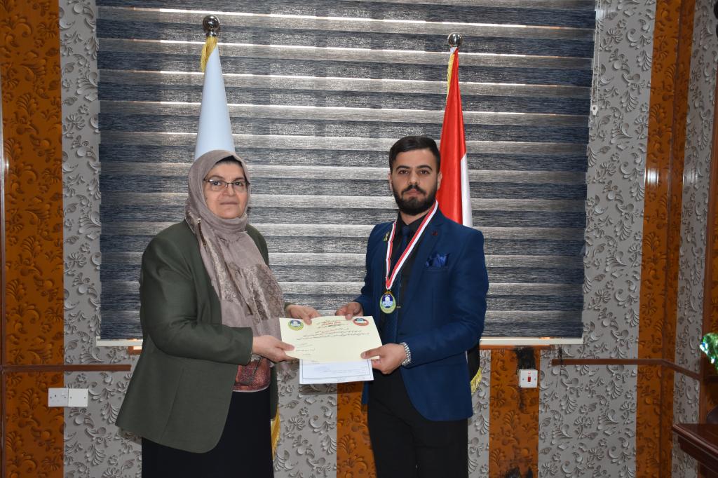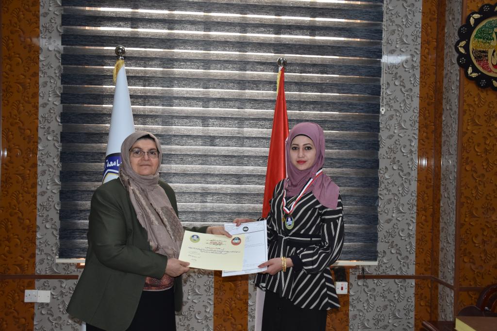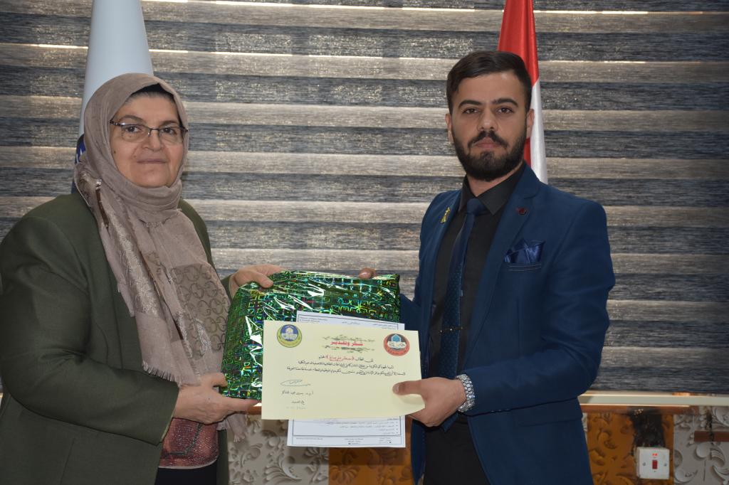 تكريم عدد من الطلبة المتميزين في كلية علوم البيئة وتقاناتها الذين مثلو الكلية باجمل صورة في الفعاليات والمسابقات على مستوى جامعة الموصل.قامت عمادة علوم البيئة وتقاناتها متمثلة بالسيدة عميد الكلية الدكتورة يسرى مجيد الشاكر اليوم الثلاثاء 20 نيسان 2021 بتكريم عدد من الطلبة الذين حققو انجازات رائعة في المسابقات على مستوى الجامعة وهم كل منالطالب (مصطفى علي صالح) مرحلة ثالثة قسم علوم البيئة على النشاطات التي يقدمها والعمل الكبير ورفع اسم الكلية في جميع المحافل الجامعية .تكريم الطالبة (نبأ احمد مولود) مرحلة ثانية قسم علوم البيئة بعد حصولها على المركز الثاني في (ماراثون عيد الجامعة) وهو يعد انجاز كبير ونتمنى لها التقدم المستمر والمزيد من العطاء .تكريم الطالب (حسين سمير حسين) مرحلة ثالثة قسم تقانات البيئة بعد الحصول على المركز الأول على مستوى الجامعة في مسابقة الرسم التي نظمتها رئاسة الجامعة.تكريم الطالبة (نور علي نجم الدين) مرحلة رابعة قسم تقانات البيئة بعد الحصول على المركز الخامس على مستوى الجامعة في مسابقة الرسم التي نظمتها رئاسة الجامعة.حيث قدمت السيدة العميدة الجوائز والشهادات التقديرية للطلبة بحضور السادة المعاون الاداري, ورئيس قسم العلوم ومسؤول النشاطات الطلابية ومدير الادارة.نتمنى كل التوفيق لطلبتنا والاستمرار بالأبداع ورفع اسم الكلية والجامعة في جميع المحافل.شعبة الاعلام والعلاقات العامة.