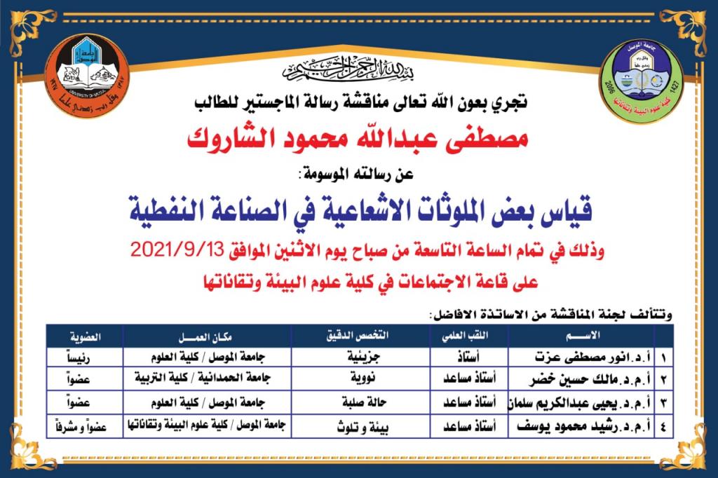 ستجرى بعون الله مناقشة رسالة الماجستير للطالب مصطفى عبد الله محمود الشاروك عن رسالته الموسومة ” قياس بعض الملوثات الإشعاعية في الصناعة النفطية ” وذلك في تمام الساعة التاسعة من صباح يوم الاثنين 13 ايلول ٢٠٢١ على قاعة الاجتماعات في كلية علوم البيئة وتقاناتها.شعبة الإعلام والعلاقات العامة