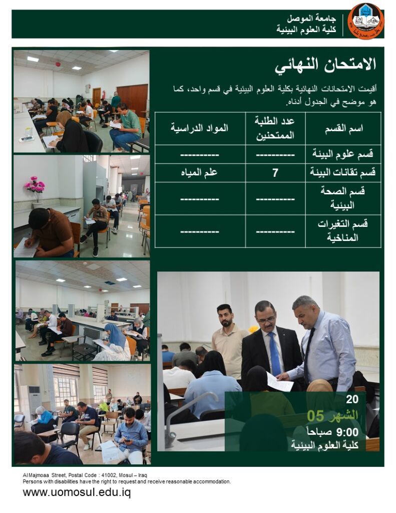 باشراف السيد عميد الكلية الاستاذ الدكتور مثنى جاسم محمد الطائي جرى صباح اليوم الثلاثاء 20 ايار 2025 مناقشة مشاريع التخرج لطلبة المرحلة الرابعة في قسم تقانات البيئة , والتي تمثل جزء من متطلبات التخرج والتأهل لممارسة العمل في مؤسسات الدولة المختلفة.