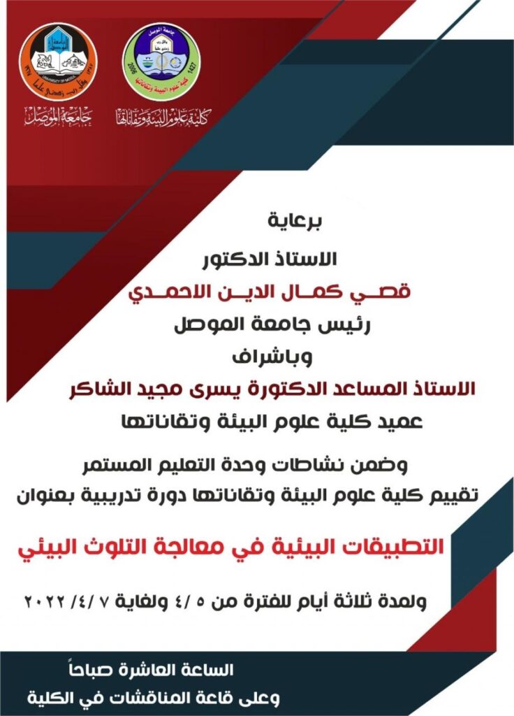 برعاية الاستاذ الدكتور قصي كمال الدين الاحمدي رئيس جامعة الموصل وحضور الاستاذ الدكتور وحيد محمود الابراهيمي المساعد الاداري ممثلاً عن سيادته ،احتضنت كلية علوم البيئة وتقاناتها اعمال الدورة التدريبية الموسومة “تطبيقات تقنية النانو في العلوم البيئية” للفترة من 27 – 29 آذار 2022، وبحضور السيدة عميد الكلية الاستاذ المساعد الدكتورة يسرى مجيد الشاكر وعدد من عمداء الكليات وتدريسييها .تضمن برنامج الندوة في يومها الاول اربع محاضرات بحثت في واقع وطموحات تطبيقات النانوتكنولوجي ودورها في الصناعات البيئية وآليات تشكيل المواد بالهيئة النانوية ومخاطر تلك التطبيقات والتي شارك بها عدد من تدريسيي كليتنا.يذكر ان الندوة في يومها الثاني ستتناول المواد النانوية في النفايات وطب النانو واستخدام الاسمدة النانوية لتحسين المحاصيل الزراعية.اما اليوم الثالث ستبحث محاضراتها في استخدام هذه التقنية في معالجة المياه وفي مجال طب الاسنان والتأثيرات السلبية للأسمدة النانوية على الكائنات الحية.هذا وخصصت الدورة جلسةً لقراءة جملة التوصيات التي تدور في اطار تقنية النانو واسهامها في تطور الحياة والحفاظ على البيئة.شعبة الاعلام والعلاقات العامة