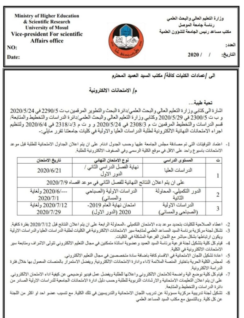 تنفيذا لتوجيهات السيد رئيس جامعة الموصل الأستاذ الدكتور قصي كمال الدين الاحمدي المحترم، وبإشراف مباشر من قبل السيدة عميد كلية علوم البيئة وتقاناتها الأستاذ المساعد الدكتورة يسرى مجيد الشاكر، عقد مجلس قسم تقانات البيئة اجتماعه برئاسة رئيس القسم الأستاذ المساعد الدكتور رياض عبدالله فتحي وذلك يوم الاربعاء الموافق 10/6/2020 وبحضور أغلب أعضاء هيئة التدريس في القسم، وتم مناقشة الاستعدادات للامتحانات التكميلية والنهائية لطلبة المراحل الدراسية المختلفة، كما تم الاطلاع على التعليمات الوزارية والجامعية بهذا الخصوص، وقد أبدى الجميع الجاهزية الكاملة لإجراء الامتحانات ان شاء الله.