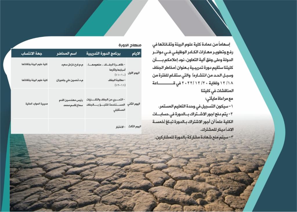 عميد كلية علوم البيئة وتقاناتها وضمن نشاطات وحدة التعليم المستمر تقييم كلية علوم البيئة وتقاناتها دورة تدريبية بعنوان:”مخاطر الجفاف وسبل الحد من انتشاره”