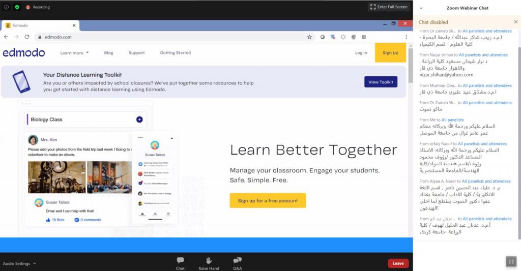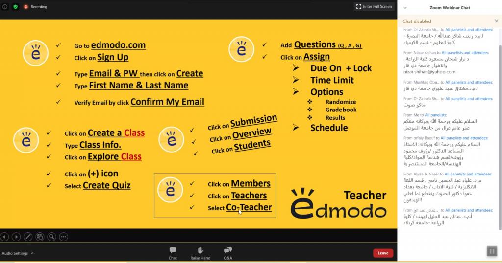 مشاركة تدريسيان من كلية علوم البيئة وتقاناتها في الدورة التدريبية للجان الامتحانية للدراسات العليا التي يقيمها الفريق الوزاري للتعليم الالكتروني.في اطار سلسة الاستعدادات للامتحانات الالكتروني لطلبة الدراسات العليا والاولية وتنفيذا لتوجيهات السيد رئيس جامعة الموصل الاستاذ الدكتور قصي كمال الدين الاحمدي وباشراف مباشر من قبل السيدة عميد الكلية الاستاذ المساعد الدكتورة يسرى مجيد الشاكر, شارك التدريسيان في كلية علوم البيئة وتقاناتها الاستاذ المساعد الدكتور محمد ابراهيم خليل رئيس قسم علوم البيئة والمدرس المساعد عمر غانم غزال في الدورة التدريبية للجان الامتحانية للدراسات العليا التي يقيمها الفريق الوزاري للتعليم الالكتروني والتي اقيمت اليوم الثلاثاء المصادف 2/6/2020 في تمام الساعة السادسة مساء وتستمر لمدة ثلاثة ايام, تهدف الدورة الى تدريب مخولي كليات الجامعات العراقية من اجل خلق منصة الاختبارات لكامل المواد التعليمية في مرحلة الدراسات العليا وكيفية إدارة الامتحانات النهائية الالكترونية بصورة جيدة وعلى اكمل وجه ضمن كافة جوانب العمل من طبيعة الأسئلة وطرق إدخالها وكيفية سحب بطاقة الدرجات الخاصة بكل طالب وذلك من خلال منصة Edmodo.