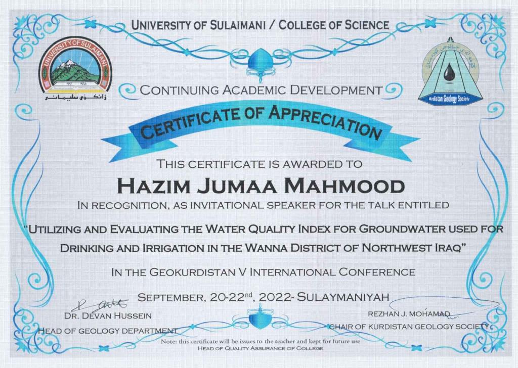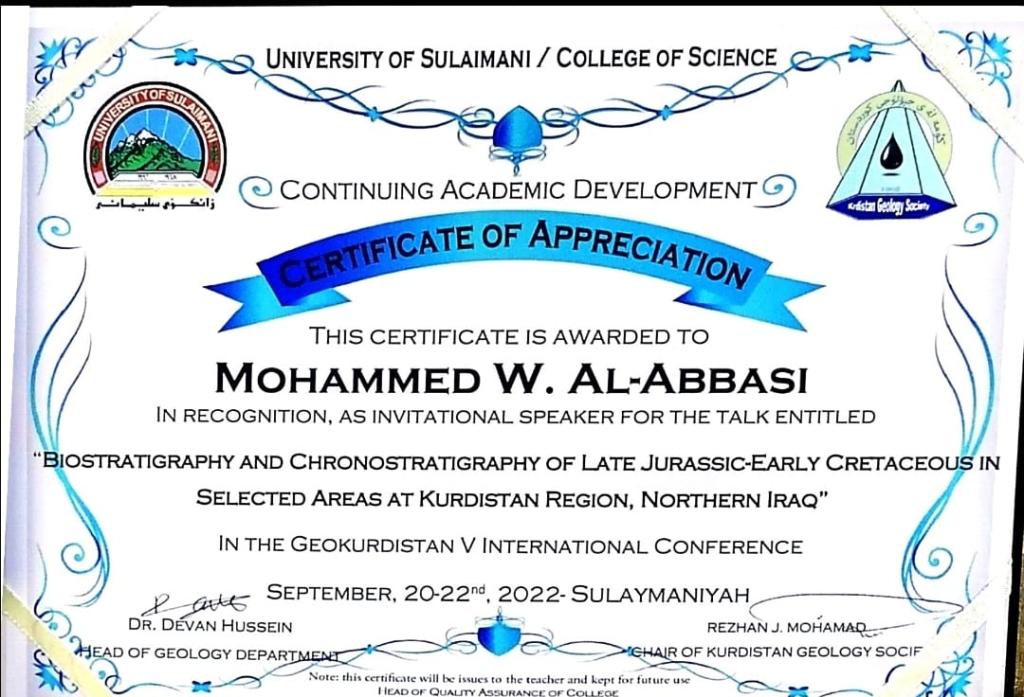 ضمن النشاطات العلمية لكلية علوم البيئة وتقاناتها شارك كل من د. محمد وليد العباسي التدريسي في قسم علوم البيئة و د. حازم جمعة النعيمي/ قسم التقانات في اعمال المؤتمر العلمي الدولي الخامس لجيوكردستان والذي اقيم في رحاب جامعة السليمانية للفترة من 20- 22 ايلول 2022 من خلال القائهم بحوث في الاختصاص، وبمشاركة العديد من الباحثين من داخل وخارج العراق. متمنين لهم دوام الموفقية والعطاء .شعبة الاعلام والعلاقات العامة