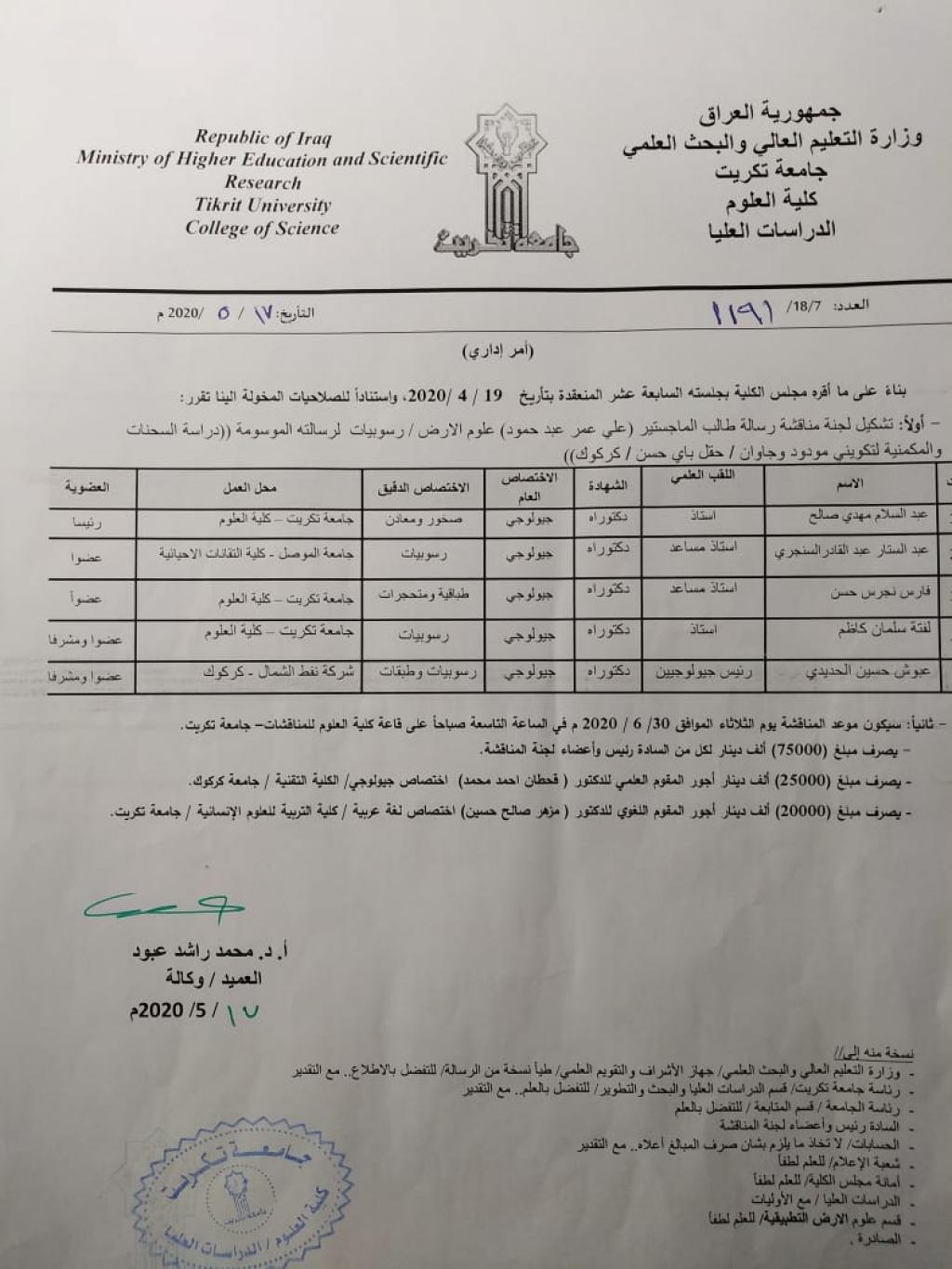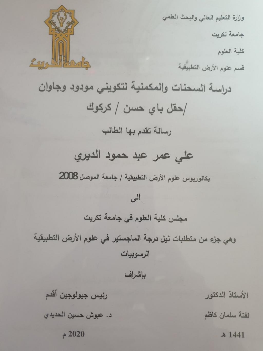 شارك الاستاذ المساعد الدكتور عبدالستار عبدالقادر علي بلجنة مناقشة رساله طالب الماجستير من قسم علوم الارض التطبيقية /كليه العلوم/جامعه تكريت كممتحن خارجيوجرت المناقشة عبر الفضاء الالكتروني باستخدام برنامج Google Meet وذلك صباح يوم الثلاثاء الموافق 30/6/2020واسفرت المناقشة عن منح الطالب شهادة الماجستير في علوم الارض.