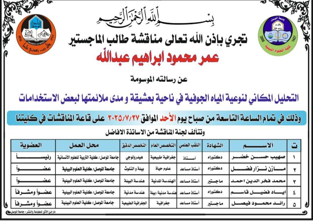 باشراف السيد عميد كلية العلوم البيئية الاستاذ الدكتور مثنى جاسم الطائي وبمتابعة السيد رئيس قسم علوم البيئة الدكتور محمد ابراهيم خليل وضمن برنامج التدريب الصيفي لطلبة المرحلة الثالثة في قسم علوم البيئة، اجرى عدد من تدريسيي القسم زيارة الى طلبة التدريب الصيفي في مشروع ماء الزهور , مديرية بلدية الموصل , مشروع ماء الايسر القديم والتوسعة , مشروع ماء الدندان , مركز بحوث البيئة.