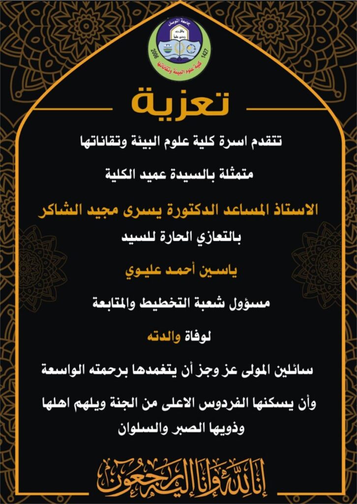 انطلقت يوم امس الاحد 9 كانون الثاني 2022 الدورة التدريبية الموسومة ((معالجة مياه الفضلات)) وتستمر لمدة ثلاثة ايام القى خلالها السيد رئيس قسم تقانات البيئة الاستاذ المساعد الدكتور اياد فضيل قاسم محاضرة بعنوان ” مقدمة عن مياه الفضلات” وبحضور السيدة عميد الكلية الاستاذ المساعد الدكتورة يسرى مجيد الشاكر والسيد معاون العميد للشؤون العلمية الدكتور علي بشير عزيز وعدد من اساتذة الكلية.تناولت المحاضرة تعريف لمياه الفضلات ومصادرها كما تطرقت إلى خصائص المياه الفيزيائية والكيميائية والبايولوجية وطرق معالجتها.شعبة الاعلام والعلاقات العامة
