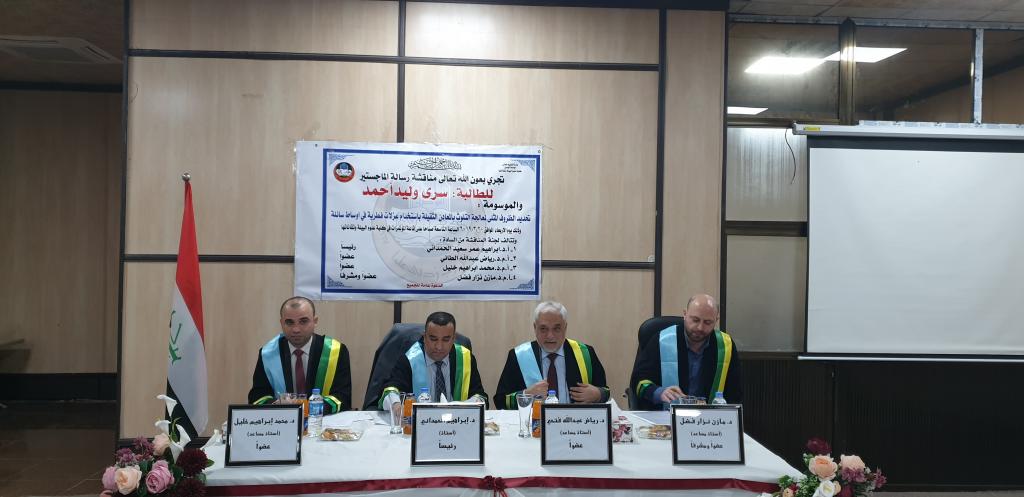 نوقشت وبعونه تعالى وفي تمام الساعة التاسعة من صباح يوم الأربعاء الموافق (٢٠١٩/٣/٢٠) وعلى القاعة الرئيسية في كلية علوم البيئة وتقاناتها /جامعة الموصل رسالة الماجستير التي أعدتها الطالبة ( سرى وليد أحمد ) الطالبة في قسم علوم البيئة والموسومة ب(تحديد الظروف المثلى لمعالجة التلوث بالمعادن الثقيلة بأستخدام عزلات فطرية في أوساط سائلة )وقد تألفت لجنة المناقشة بموجب الأمرالجامعي من الأستاذ الدكتور إبراهيم الحمداني رئيسا وعضوية كل من الأستاذ المساعد الدكتور رياض عبدالله فتحي والأستاذ المساعد الدكتوره محمد إبراهيم خليل عضوا والدكتور مازن نزار فضل عضوا ومشرفا وبعدها قرأ قرار اللجنة المناقشة وتضمن قبول الرسالة مع منح الطالبة درجة الماجستير وبتقدير إمتياز