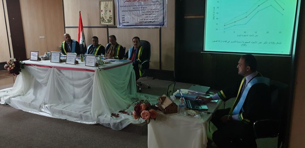 نوقشت وبعونه تعالى وفي تمام الساعة التاسعة من صباح يوم الأربعاء الموافق (٢٠١٩/٤/٣) وعلى رحاب القاعة الرئيسية في كلية علوم البيئة وتقاناتها /جامعة الموصل رسالة الماجستير التي أعدها الطالب ( يحيى رياض خضر) الطالب في قسم علوم البيئة والموسومة ب(تأثير عمر الأحياء المجهرية ونسبتي التدوير والترجيع في كفاءة إزالة الملوثات في أنظمة المعالجة البيولوجية العاملة بنظام باردنفو ) وقد تألفت لجنة المناقشة بموجب الأمر الجامعي من الأستاذ الدكتور عبد الحميد محمد جواد رئيساً وعضوية كل من الأستاذ المساعد الدكتورمازن نزار فضل والأستاذ المساعد السيد طه أحمد طه الطيار عضواً والأستاذ الدكتور قصي كمال الدين الأحمدي رئيس جامعة الموصل عضواً ومشرفاً وبعدها قرأ قرار اللجنة المناقشة وتضمن قبول الرسالة ،وحصول الطالب على شهادة الماجستير وبتقدير إمتياز