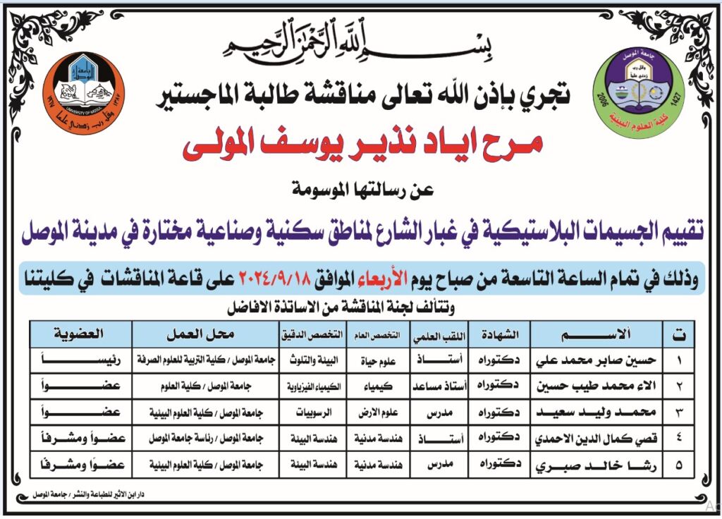 مناقشة رسالة ماجستير في كلية العلوم البيئية تتعلق بالجسيمات البلاستيكية في غبار الشارع في مدينة الموصل ..