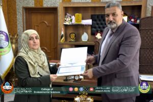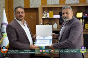وفي ختام المناقشة، قدم السيد عميد كلية العلوم البيئية الاستاذ الدكتور مثنى جاسم الطائي كتاب شكر وتقدير إلى الاستاذ الدكتور شهاب احمد يوسف، الجامعة التقنية الشمالية/ الكلية التقنية الزراعية , والاستاذ المساعد الدكتورة وسن خير الله علي , جامعة الموصل / كلية العلوم .