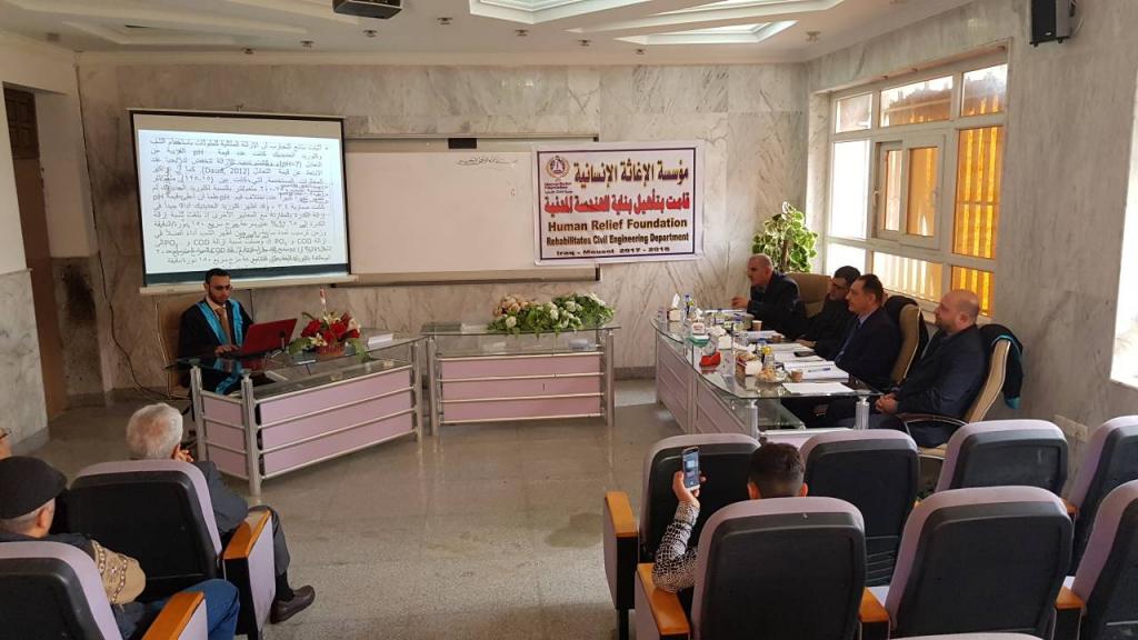 نوقشت وبعونه تعالى في تمام الساعة التاسعة من صباح يوم الاثنين الموافق 2018/3/5في رحاب قاعة المناقشات في قاعة المرحوم نجيب خروفة في كلية الهندسة ،رسالة الماجستير التي أعدها الطالب ( عمر مؤيد خليل ) من قسم علوم البيئة ،كلية علوم البيئة وتقاناتها ،جامعة الموصل والموسومة ب "تأثير محطة معالجة الخضراء في نوعية مياه وادي الدنفيلي في مدينة الموصل "وقد تألفت لجنة المناقشة بموجب الأمر الجامعي من الأستاذ الدكتور قصي كمال الدين الأحمدي رئيسا .وعضوية كل من الأستاذ المساعد الدكتور وليد محمد شيت العبدربه عضوا .والدكتور مازن نزار فضل عضوا.والدكتور أياد فضيل قاسم عضوا ومشرفا .وبعدها قرأ قرار لجنة المناقشة وتضمن قبول ألرسالة مع منح الطالب درجة الماجستير وبتقدير جيد جدا