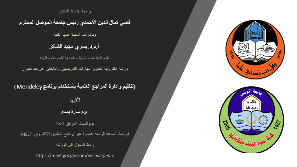 استناداً الى توجيهات رئاسة الجامعة بضرورة التواصل العلمي والالكتروني وباشراف مباشر من قبل السيدة عميد الكلية أ.م.د. يسرى مجيد الشاكر تقيم كلية علوم البيئة وتقاناتها/ قسم علوم البيئة الورشة إلكترونية الموسومة (تنظيم وادارة المراجع العلمية بأستخدام برنامج Mendeley) لتطوير مهارات التدريسيين والباحثين عن بعد, تلقيها م.م سارة بسام يوم السبت الموافق 18/4 في تمام الساعة الرابعة عصراً عبر برنامج التطبيق الالكتروني MEET. علماً انه سيتم توزيع شهادات للمشاركين في الورشة.رابط الدخول الى الورشةhttps://meet.google.com/eec-warg-wivرابط التسجيل على الورشةhttps://forms.gle/EeNCSBtq99C6PDnN8