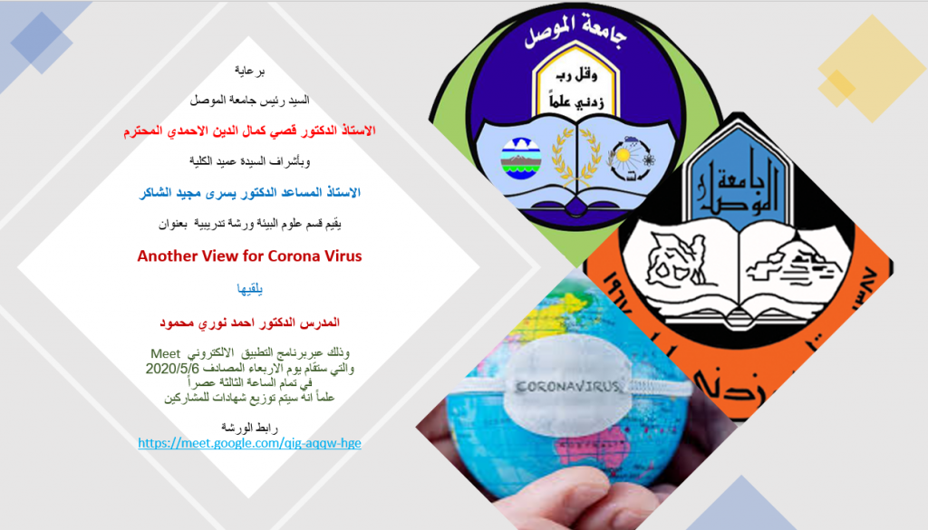 تنفيذاً لتوجيهات السيد رئيس جامعة الموصل الاستاذ الدكتور قصي كمال الدين الاحمدي بضرورة التواصل العلمي وباشراف مباشر من قبل السيدة عميد الكلية الاستاذ المساعد الدكتور يسرى مجيد الشاكر, تقيم كلية علوم البيئة وتقاناتها / قسم علوم البيئة ورشة عمل بعنوان “Another View for Corona Virus” يلقيها المدرس الدكتور احمد نوري محمود التدريسي في قسم علوم البيئة وذلك في يوم الاربعاء المصادف 6/5/2020 في تمام الساعة الثالثة عصراً عبر برنامج التطبيق الالكتروني Google Meet . علما انه سيتم توزيع شهادات مشاركة للمشاركين في الورشة.رابط الدخولhttps://meet.google.com/qig-aqqw-hge