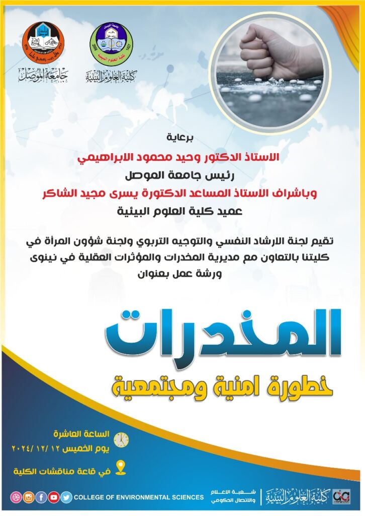 برعاية الأستاذ الدكتور وحيد محمود الابراهيمي رئيس جامعة الموصل واشراف السيدة عميد كلية العلوم البيئية الأستاذ المساعد الدكتورة يسرى مجيد الشاكر وبحضور السيد معاون العميد للشؤون العلمية الدكتور محمد وليد العباسي، اقامت كلية العلوم البيئية/ قسم التغييرات المناخية بالتعاون مع لجنة شؤون المرأة ومركز البحوث الزراعية في جمهورية مصر العربية ورشة عمل بعنوان “المدن الذكية المستدامة للتكيف مع التحديات المناخية”، اليوم الاربعاء الموافق ١١ كانون الاول ٢٠٢٤ في قاعة مناقشات الكلية.