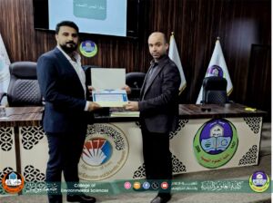 وفي الختام قدم الاستاذ الدكتور محمد ابراهيم خليل كتاب شكر وتقدير الى المدرس المساعد بلال عدي سعيد والسيد احمد حامد جاسم / مديرية بيئة نينوى.