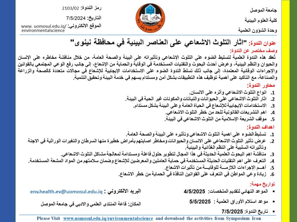 برعاية الأستاذ الدكتور وحيد محمود الابراهيمي رئيس جامعة الموصل واشراف السيد عميد كلية العلوم البيئية الأستاذ الدكتور مثنى جاسم محمد الطائي، اقامت كلية العلوم البيئية/ قسم علوم البيئة بالتعاون مع وحدة التعليم المستمر ورشة علمية بعنوان “الفساد الاداري وتأثيره على المؤسسة التعليمية” يوم الاثنين الموافق ٢٨ نيسان ٢٠٢٥، القاها المدرس المساعد سنا ربيع.