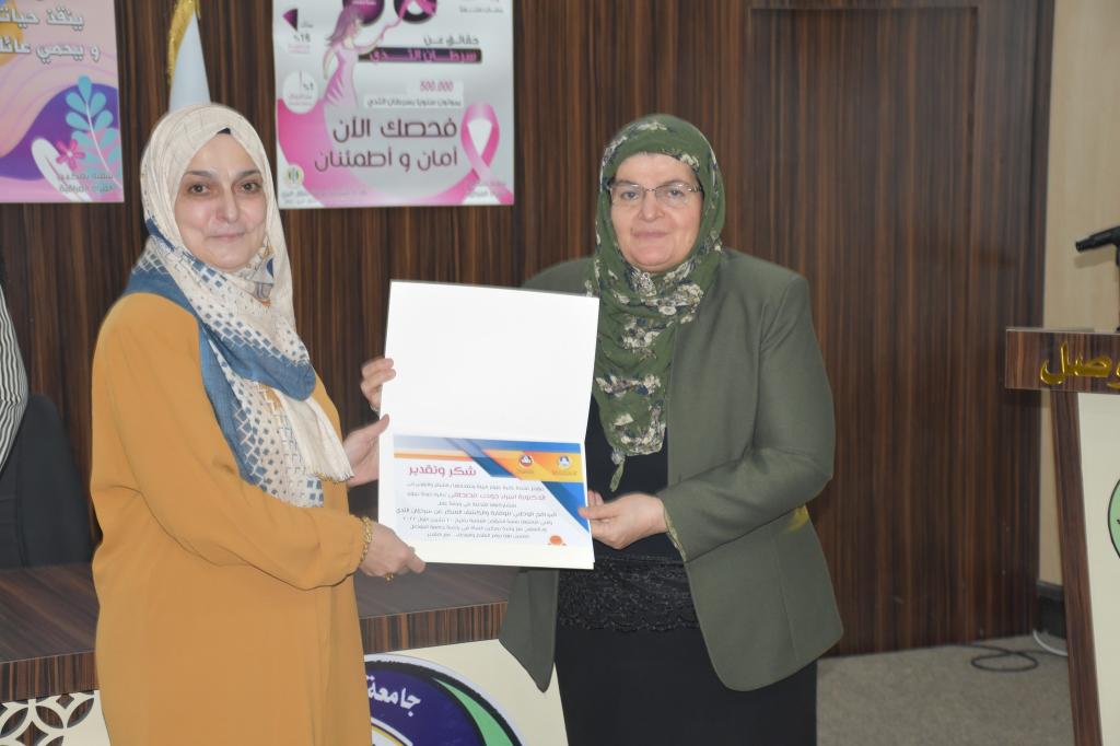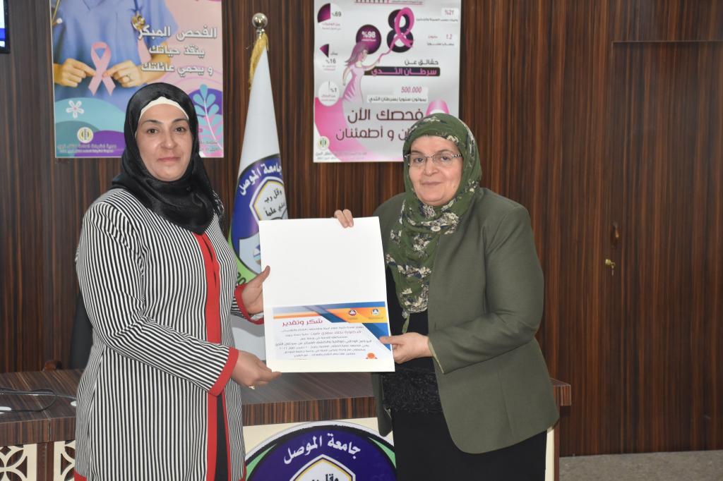 بحضور السيدة عميد كلية علوم البيئة وتقاناتها الاستاذ المساعد الدكتورة يسرى مجيد الشاكر اقامت كلية علوم البيئة وتقاناتها صباح اليوم الخميس 20 تشرين الاول 2022 وبالتعاون مع وحدة تمكين المرأة في رئاسة جامعة الموصل ورشة عمل بعنوان:( البرنامج الوطني للوقاية والكشف المبكر عن سرطان الثدي)القت خلالها الدكتورة نجلاء سعدي شيت من دائرة صحة نينوى محاضرة عن ماهية الكشف المبكرعن أورام الثدي والذي يمثل تشخيص وعلاج المرض في مراحل مبكرة قابلة للشفاء كما تطرقت الى الفحص الذاتي واوقات الفحص المبكر لسرطان الثدي.فيما تطرقت الدكتورة اسراء جودت مصطفى/ مديرة شعبة السيطرة على السرطان/ دائرة صحة نينوى الى احصائيات منظمة الصحة العالمية في هذا الخصوص حيث تم تشخيص 2,261.619 حالة سرطان ثدي جديدة خلال عام 2020 واعتبر رقم واحد في السرطانات الاكثر شيوعا لدى النساء.كان حضور الورشة متميزاً حيث حضر عدد كبير من التدريسيات والطالبات من مختلف الكليات في جامعة الموصل ومن خارج الجامعة.وفي ختام الورشة قدمت السيدة عميد الكلية الشهادات التقيرية للسادة المحاضرين. متمنين لهم المزيد من العطاء والتقدم.شعبة الاعلام والعلاقات العامة