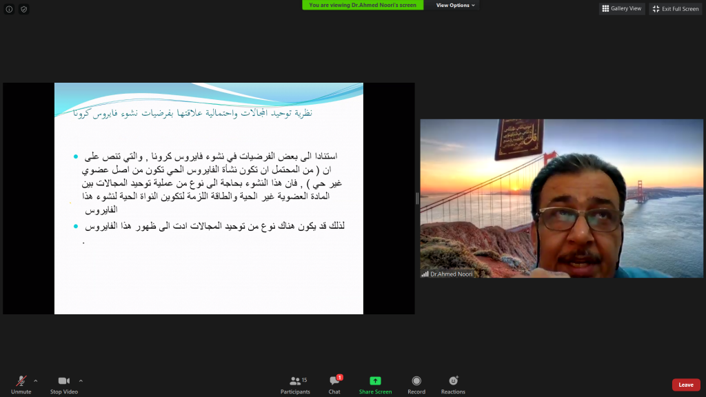 ضمن اطار نشاطات قسم علوم البيئة/كلية علوم البيئة وتقاناتها وباشراف مباشر من قبل السيدة عميد الكلية الاستاذ المساعد الدكتورة يسرى مجيد الشاكر القى التدريسي في قسم علوم البيئة المدرس الدكتور احمد نوري محمود سمنار بعنوان ” نظرية توحيد المجالات واحتمالية علاقتها بفرضيات نشوء فايروس كورونا” تناول فيه موضوع توحيد المجالات وعلاقته بالفرضيات القائمة حول اسباب نشوء فايروس COVID-19. وهدف السمنار الى استعراض لاساسيات نظرية المجالات الموحدة ، واهم تطبيقاتها العملية، وتخمين مدى احتمالية ان يكون لهذه النظرية دور في نشوء فايروس كرونا. وذلك في يوم السبت الموافق 16/5/2020 وبحضور رئيس قسم علوم البيئة واعضاء الهيئة التدريسية.