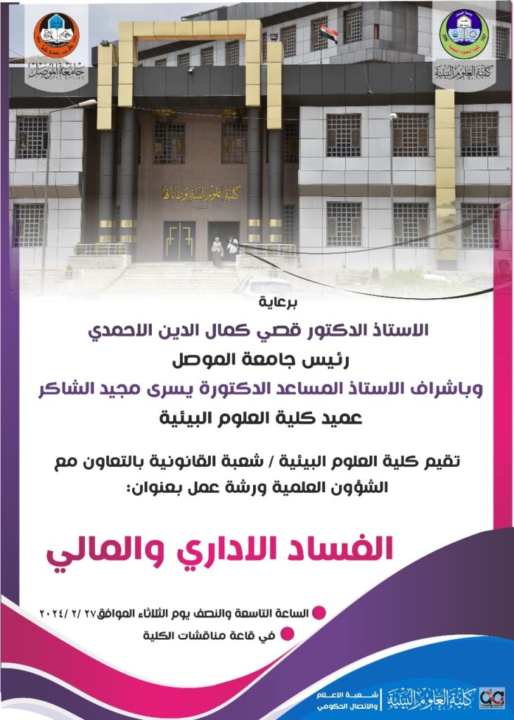 برعاية الأستاذ الدكتور قصي كمال الدين الأحمدي رئيس جامعة الموصل واشراف السيدة عميد كلية العلوم البيئية الأستاذ المساعد الدكتورة يسرى مجيد الشاكر، تقيم كلية العلوم البيئية / قسم علوم البيئة بالتعاون مع وحدة الارشاد التربوي ورشة عمل بعنوان: